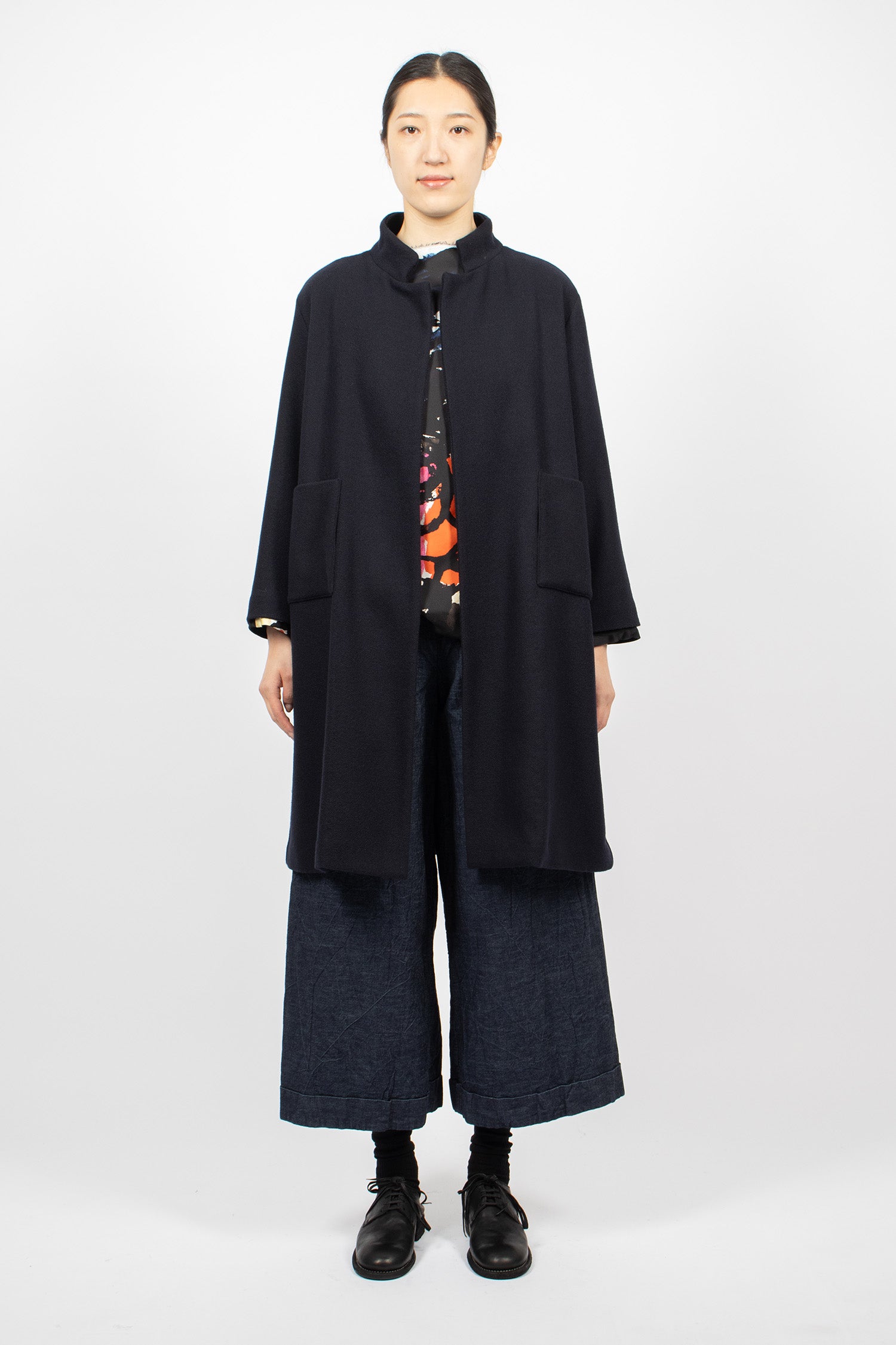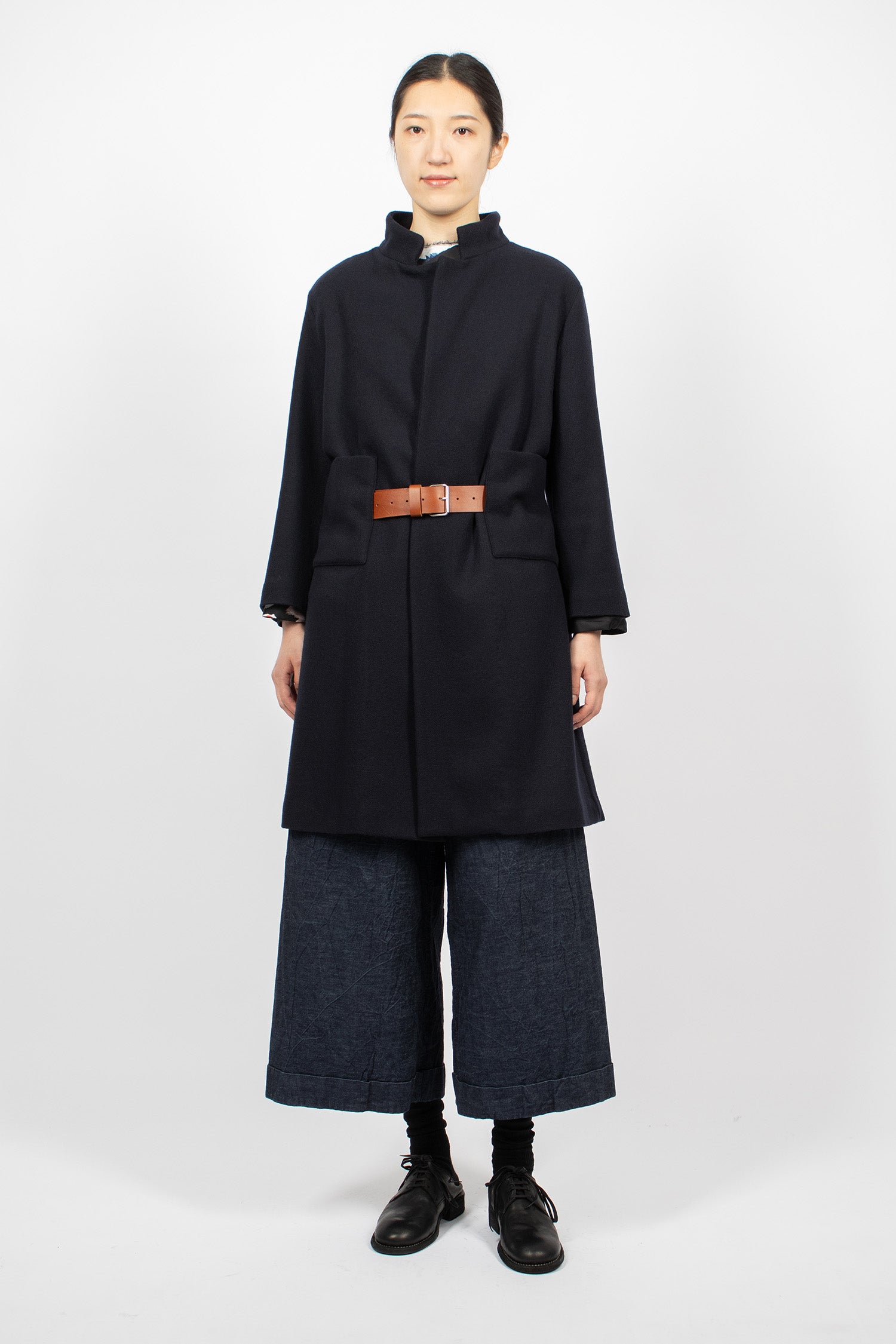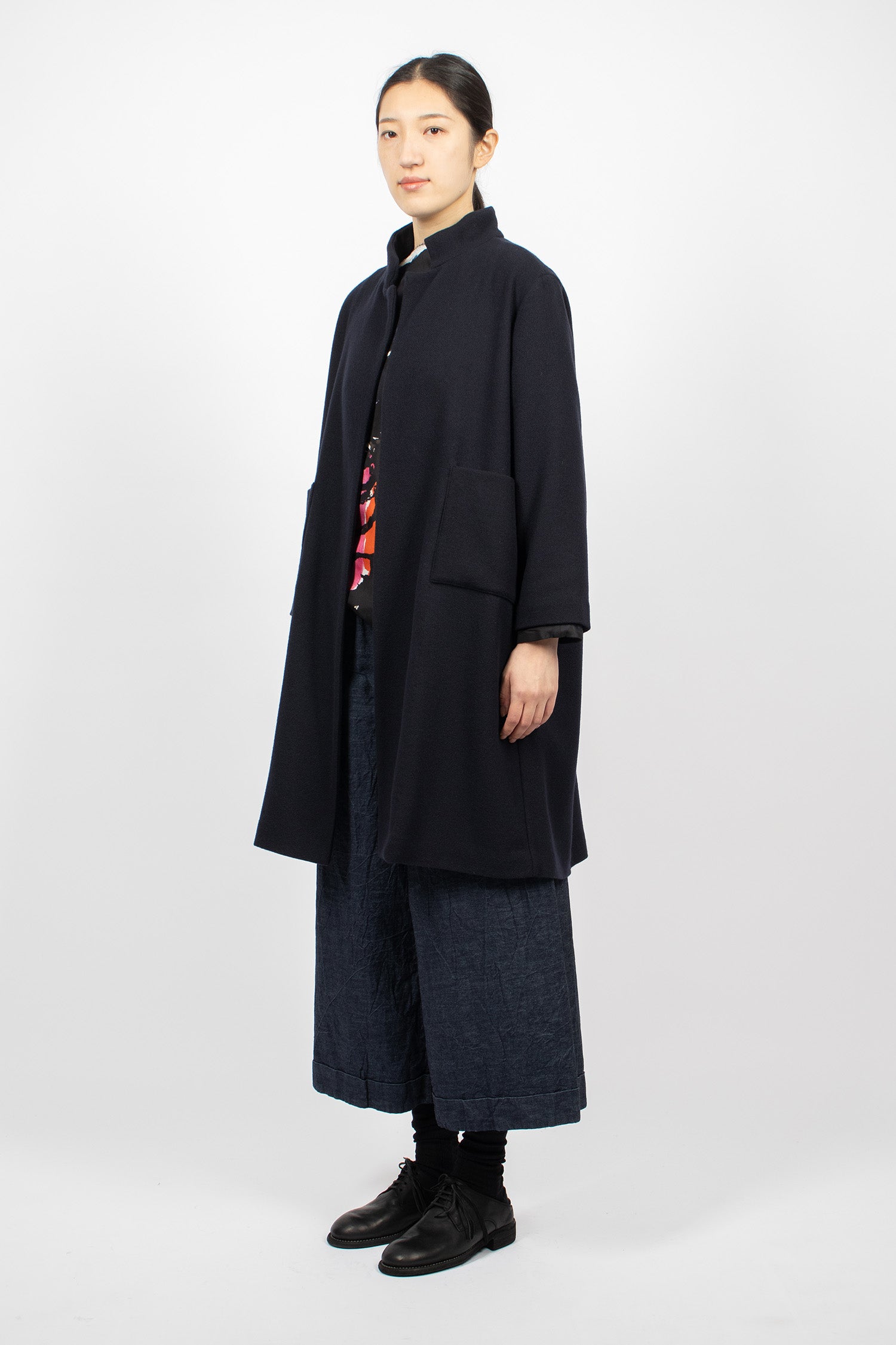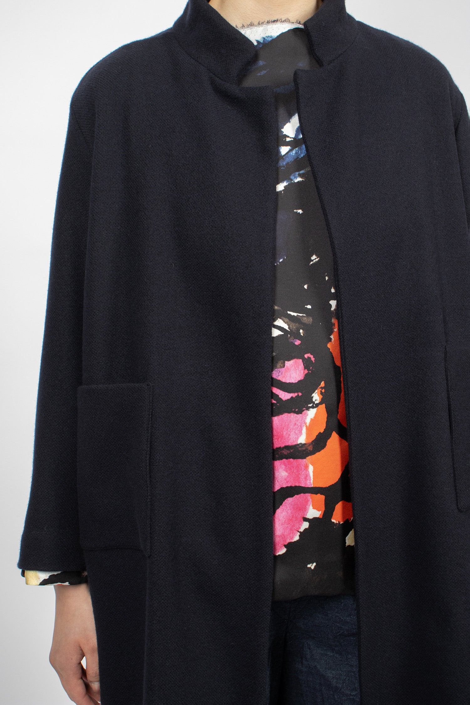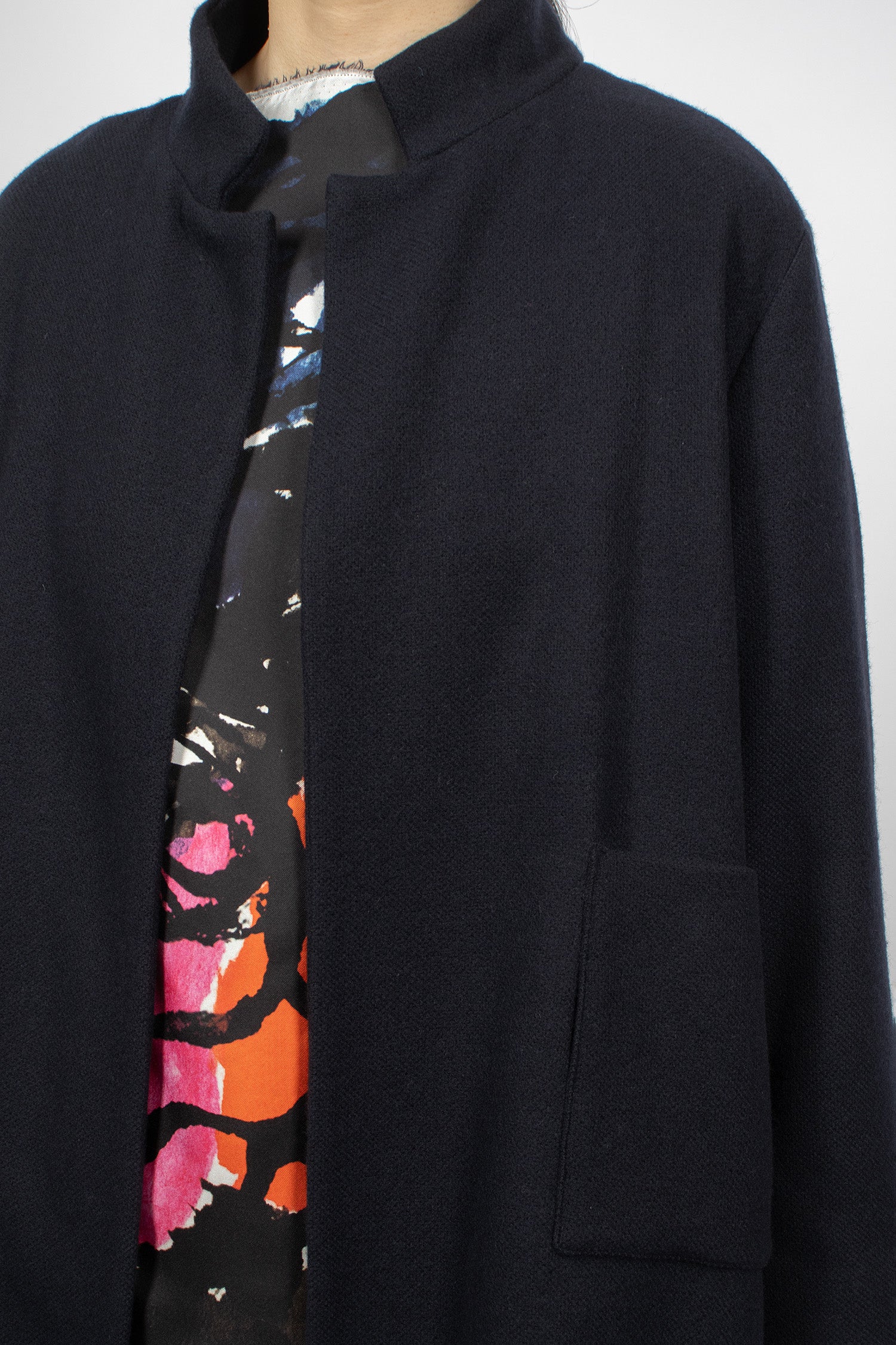 Daniela Gregis lambs wool coat in navy blue. Stand notched collar, open front, bracelet length sleeves. Straight hem with front patch pockets.