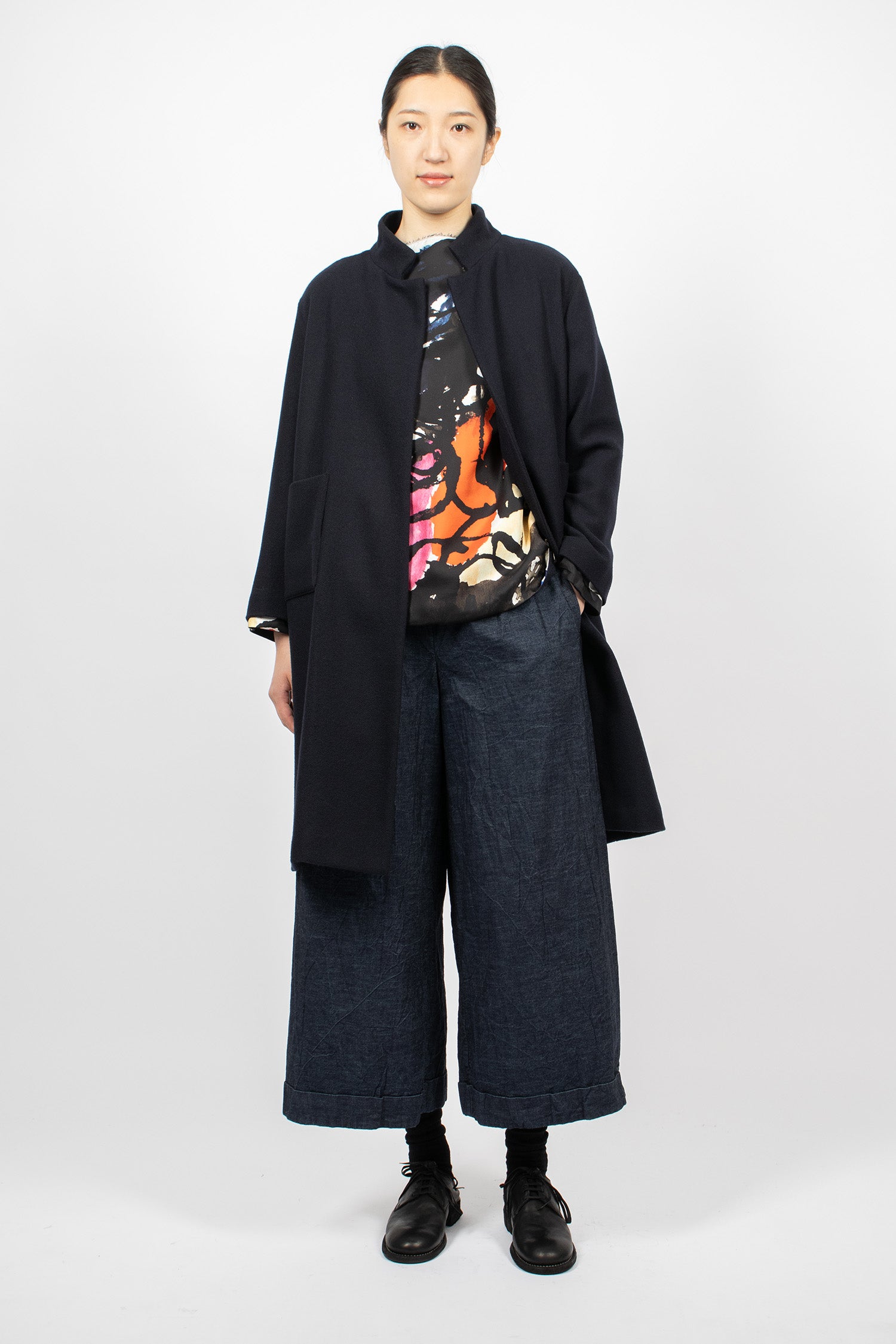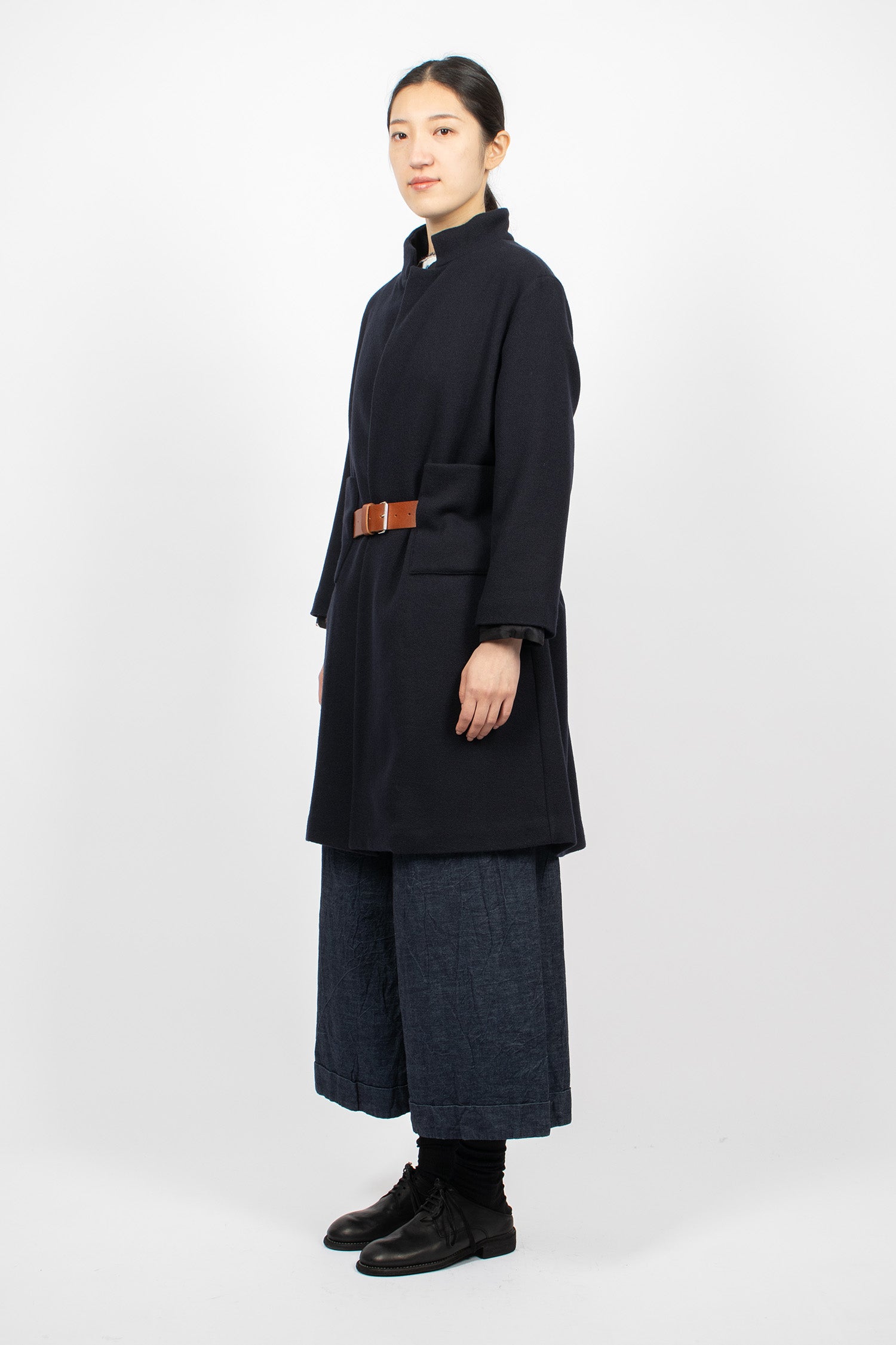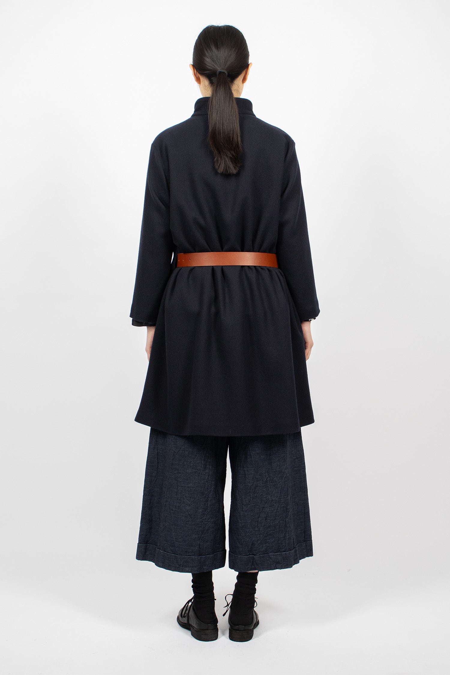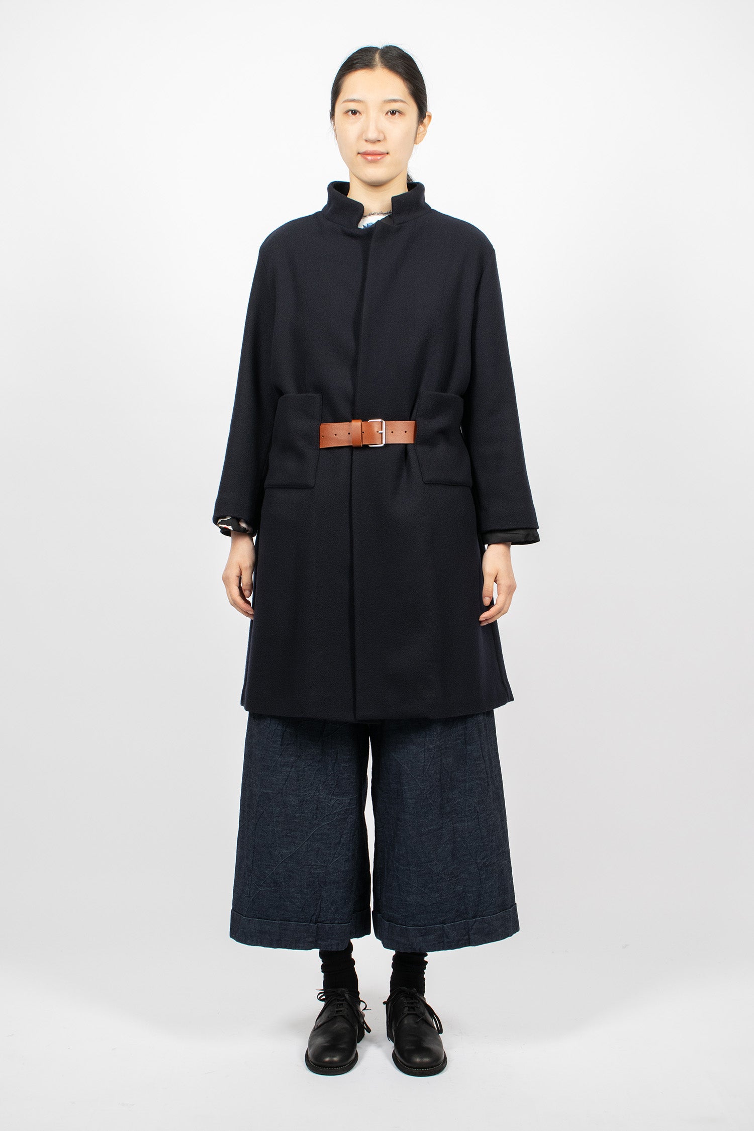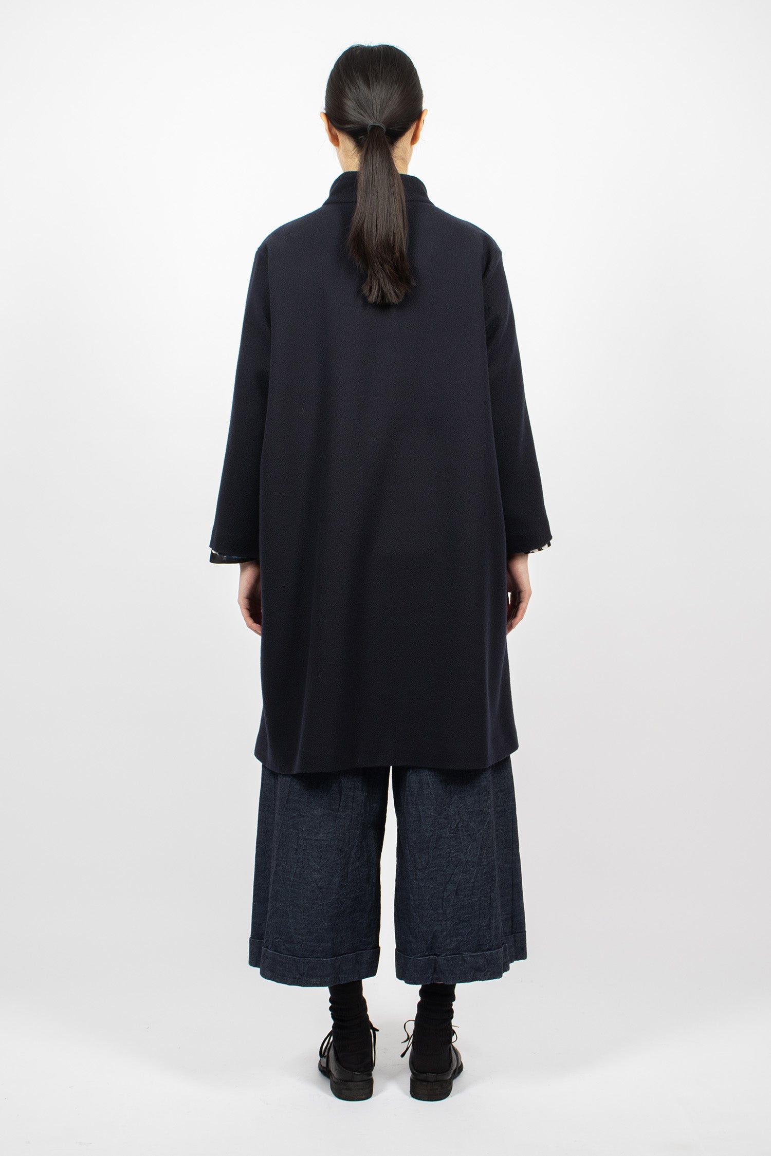 Daniela Gregis lambs wool coat in navy blue. Stand notched collar, open front, bracelet length sleeves. Straight hem with front patch pockets.