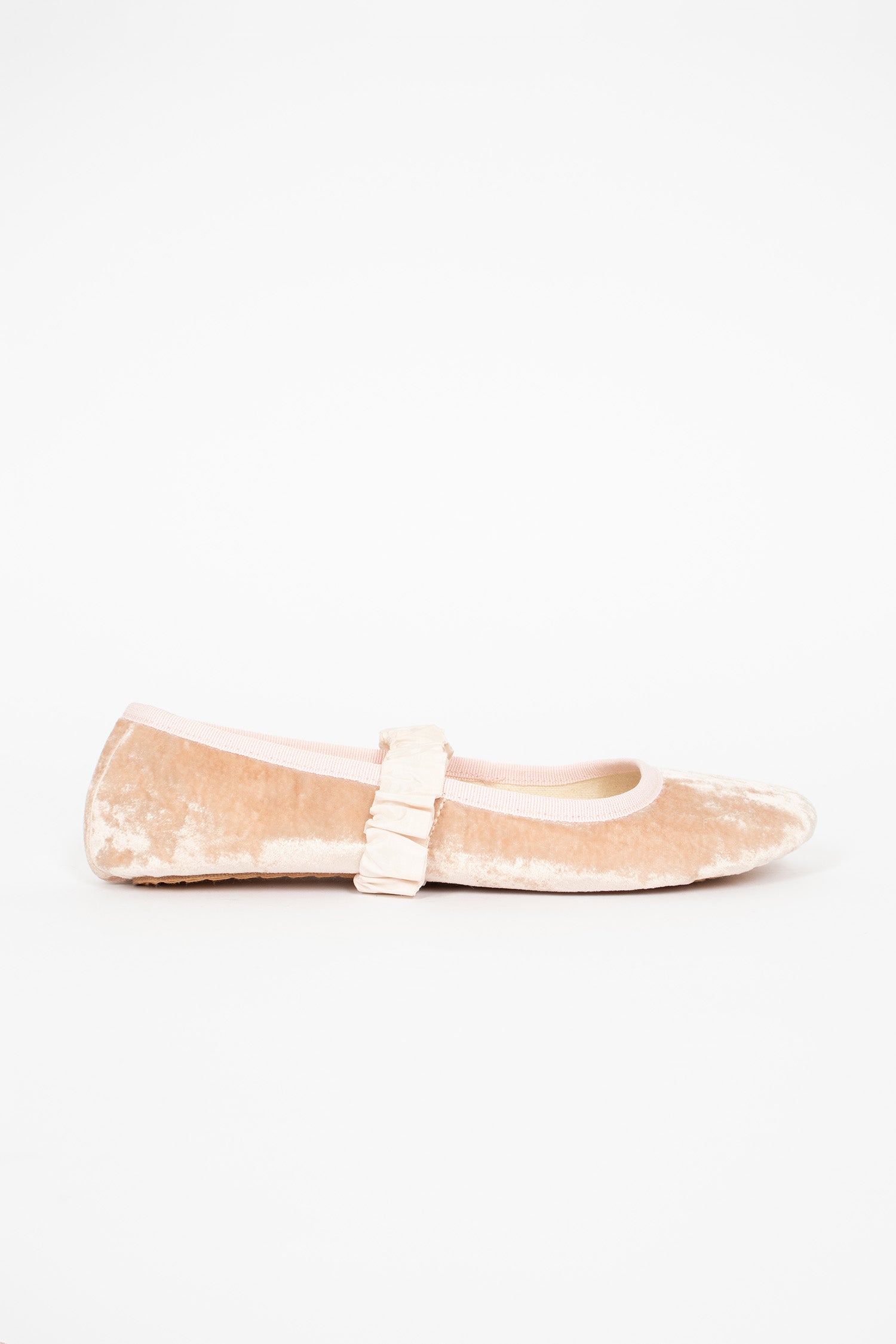 Daniela Gregis elasticated ballerina in pink powder velvet. Satin elastic strap fastening with rounded toe, canvas lining with leather innersole and outsole.
