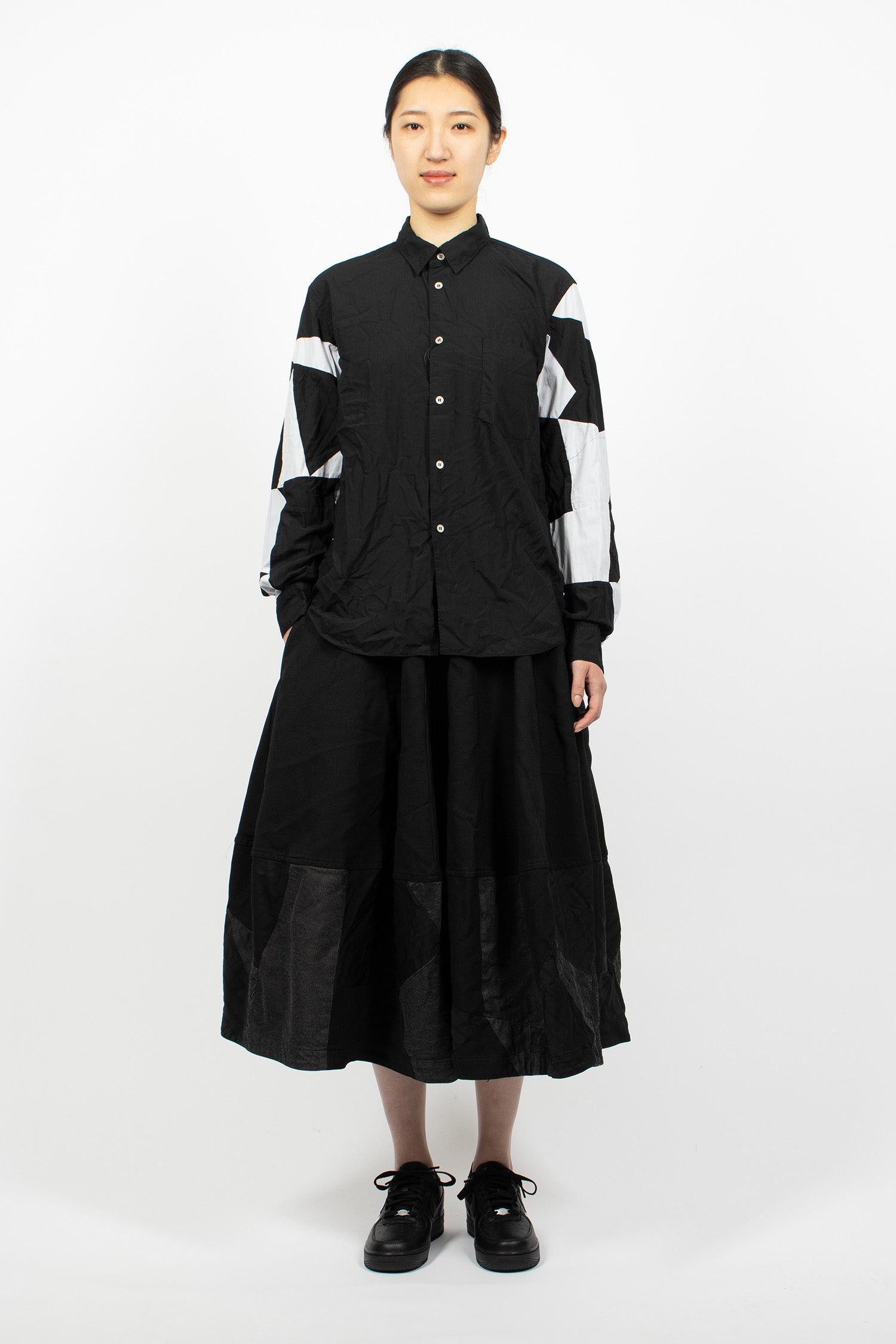 Comme Des Garçons BLACK patchwork sleeve shirt in black. Collar with button front fastening, chest patch pocket. Long sleeves in contrast patchwork, button cuffs. Curved hem. Box pleat at back yoke. Unisex fit.
