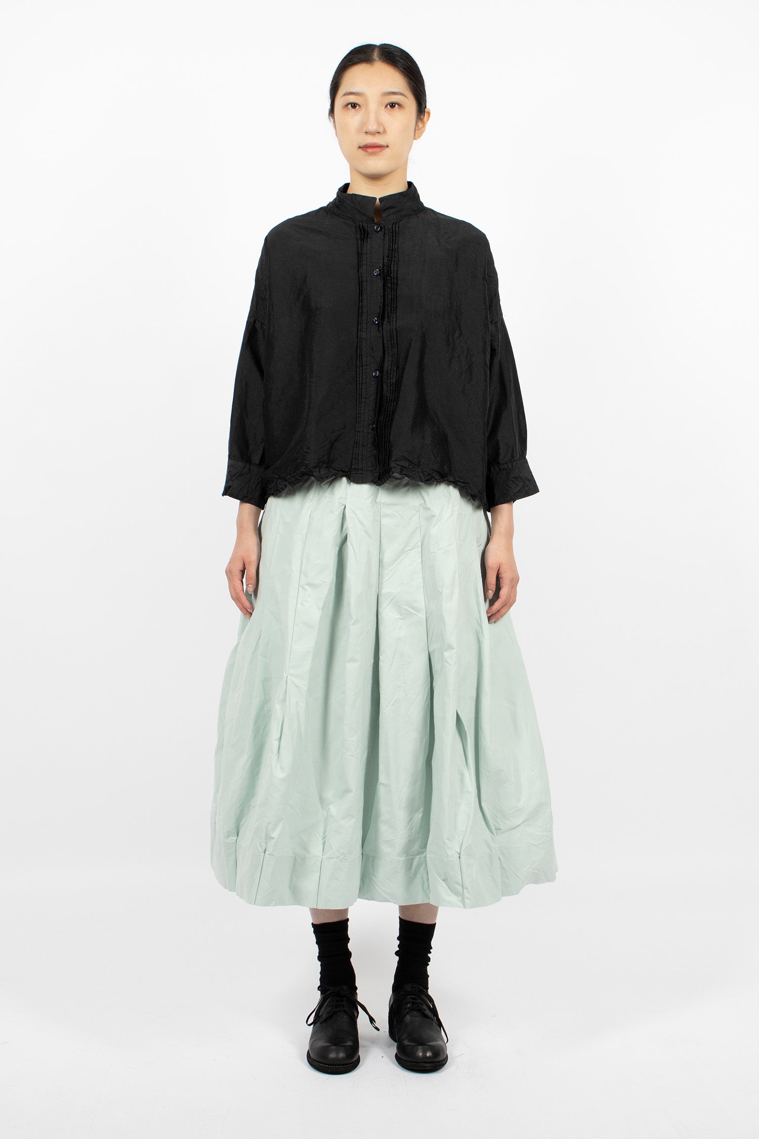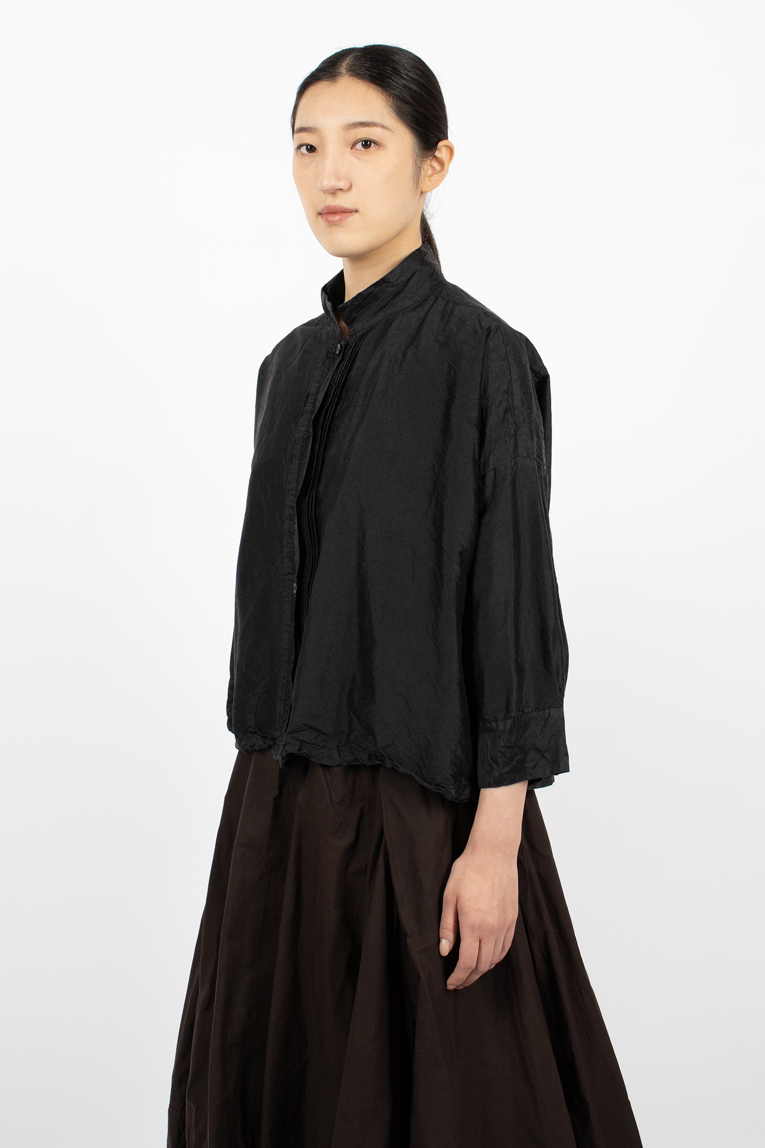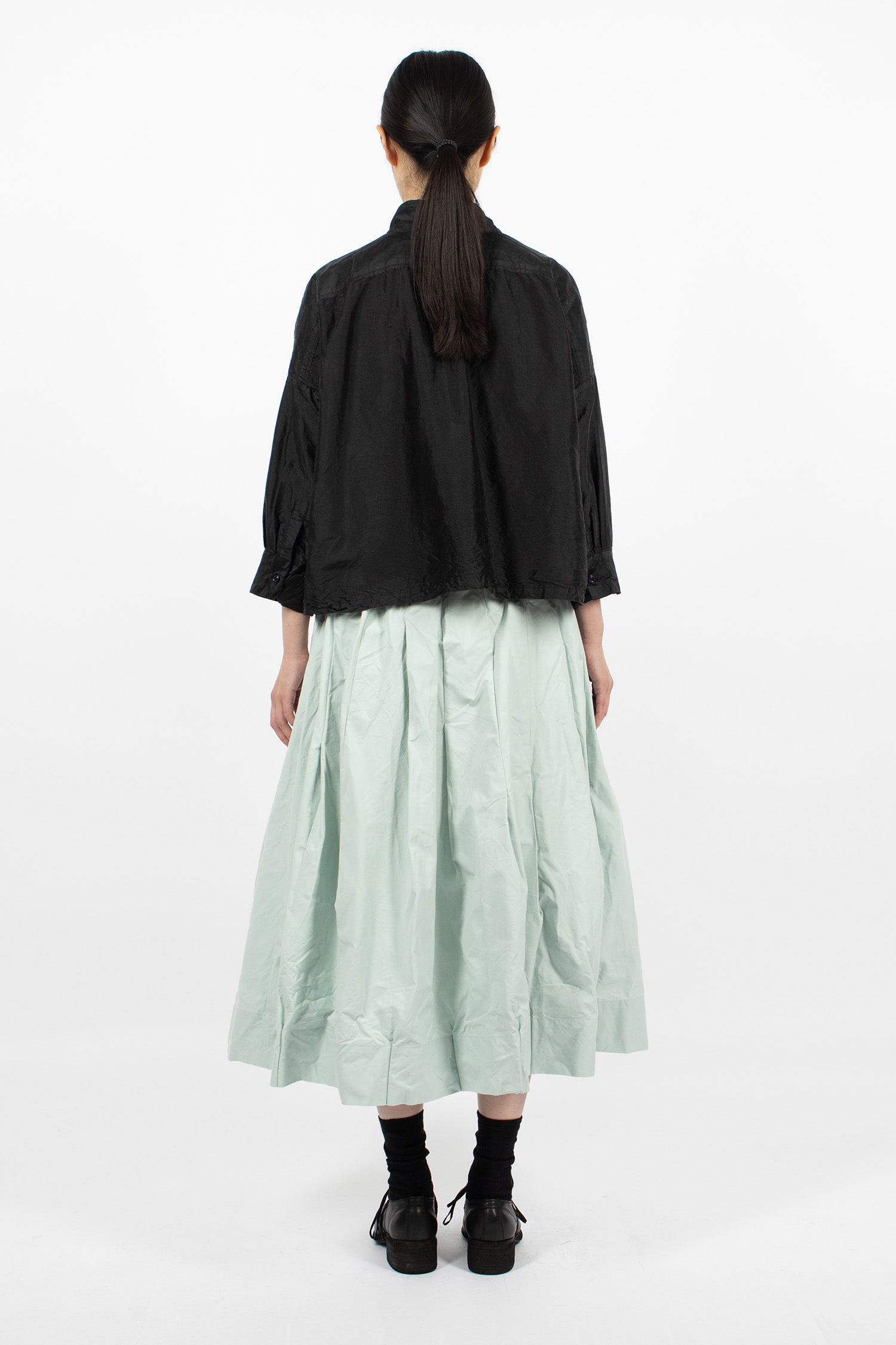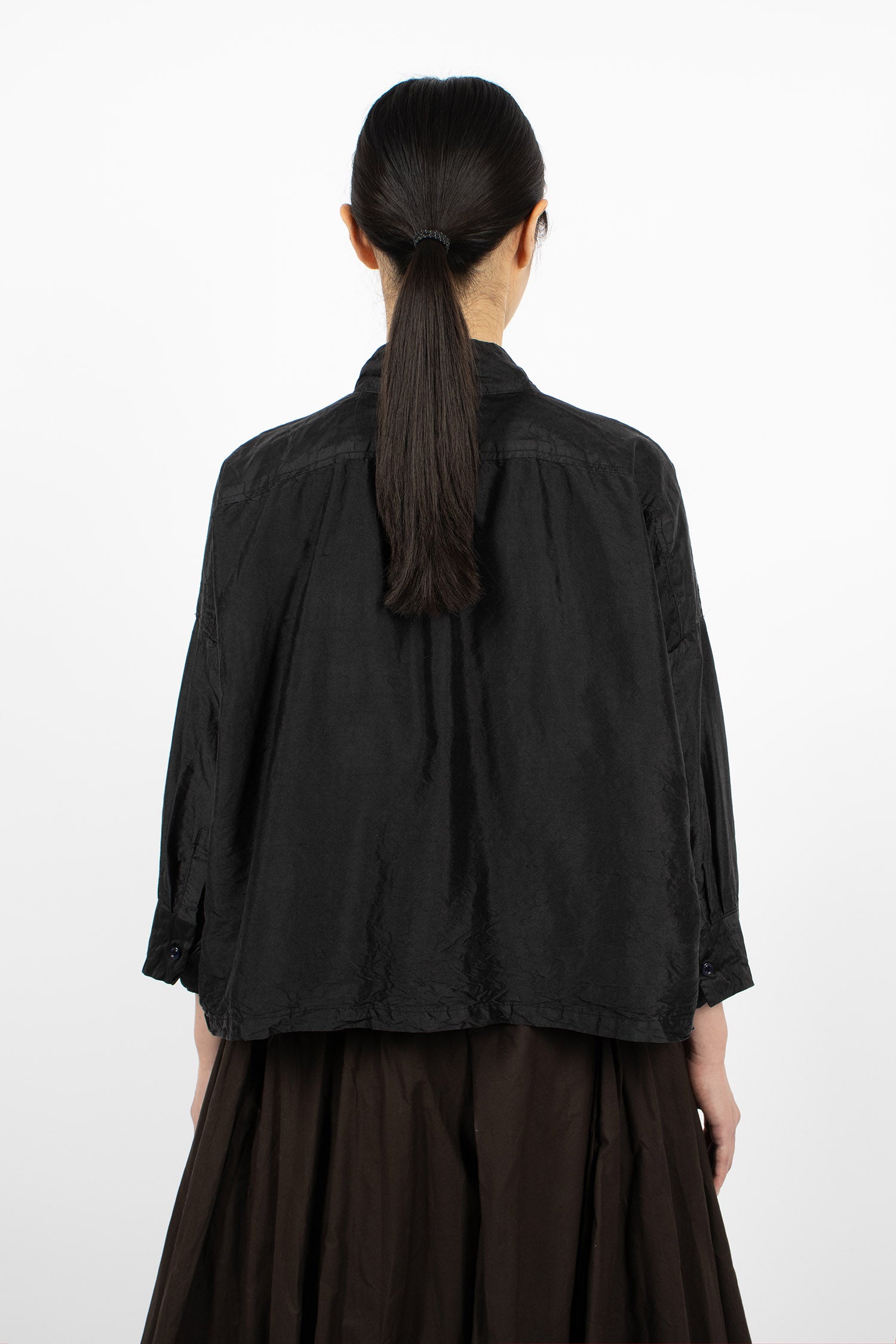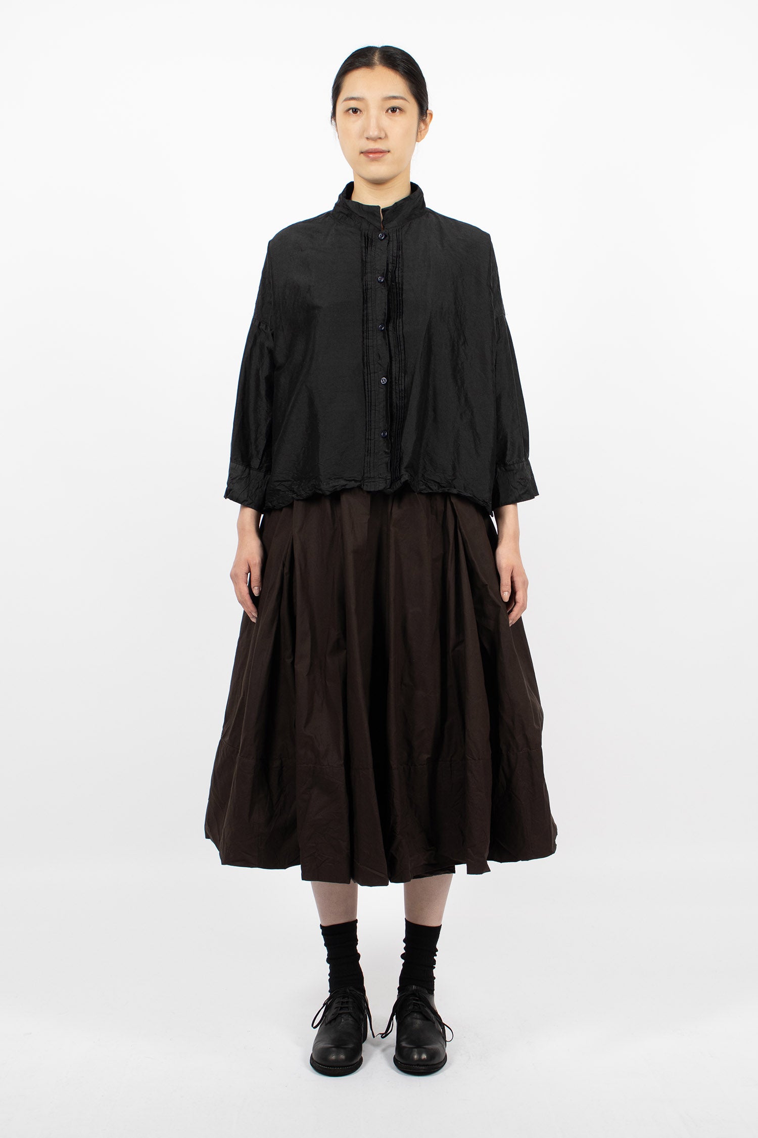 Ricorrrobe Elena dress in black silk. Button front fastening, long sleeves. Stitched detail through upper body, full skirt with pull cord details. Neat fit.
