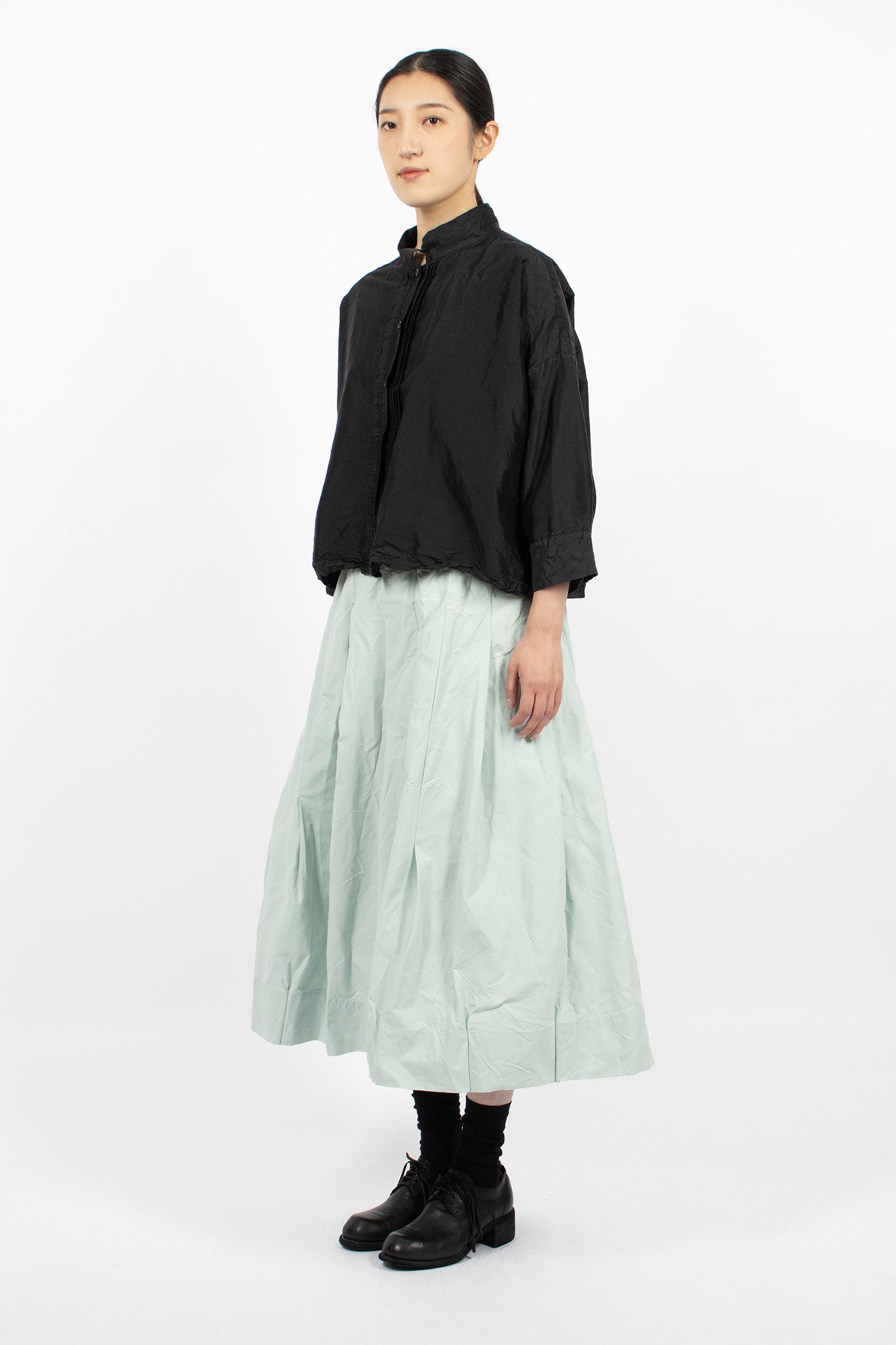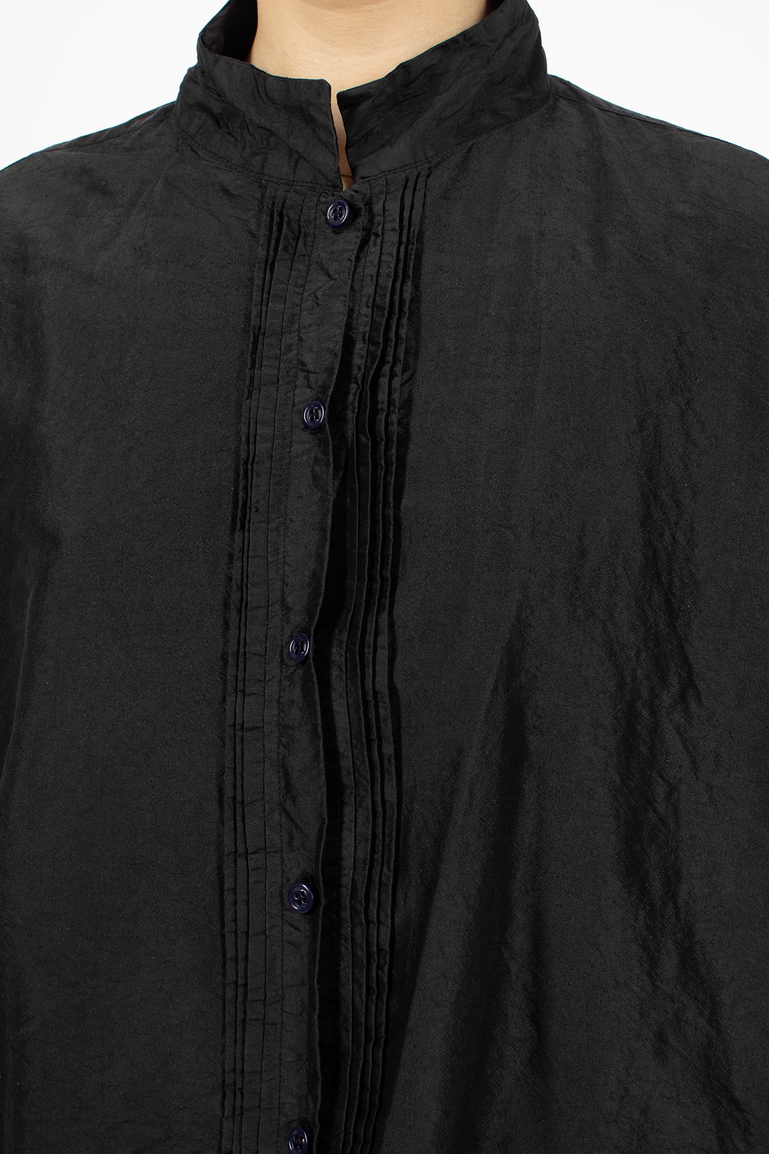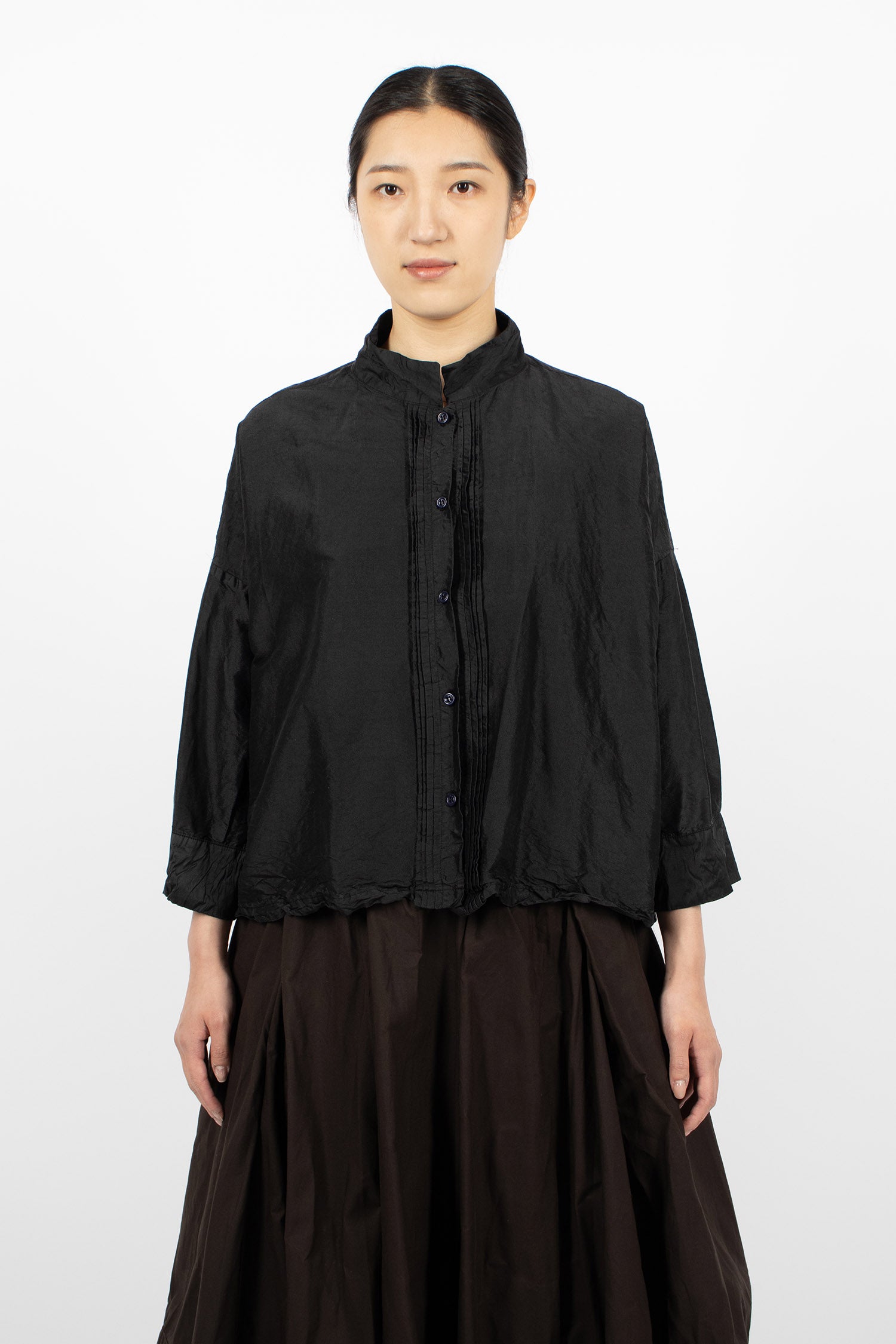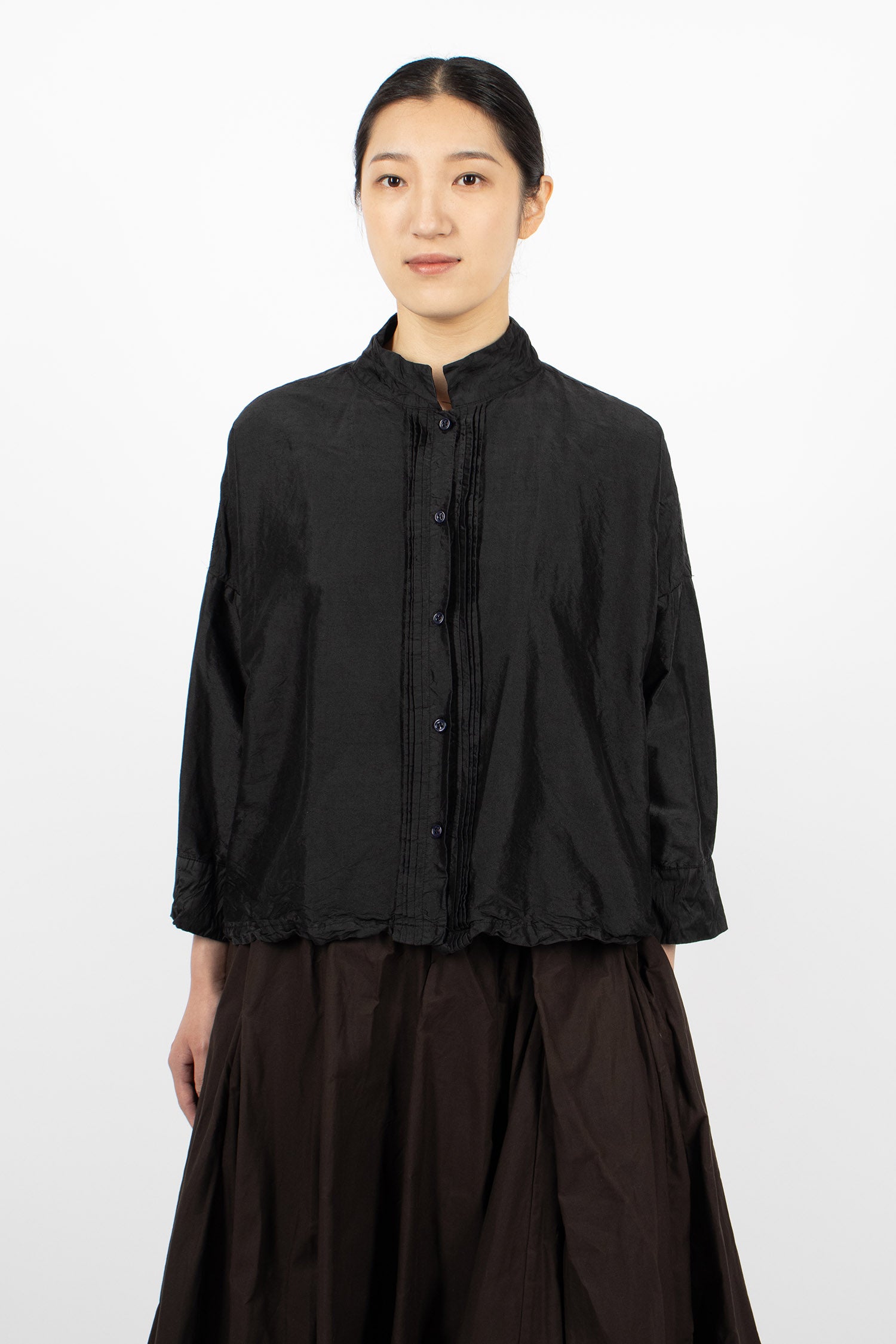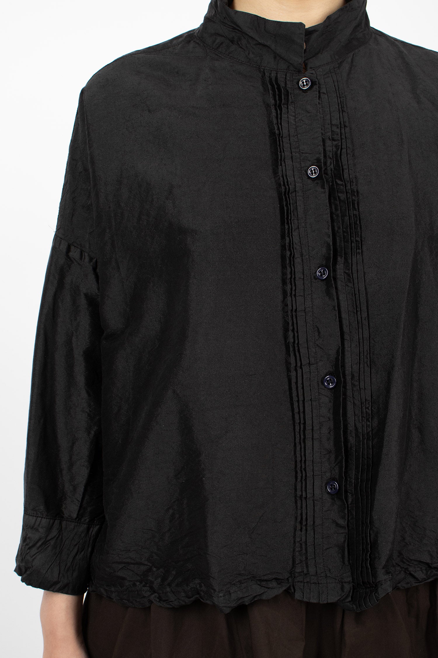 Ricorrrobe Elena dress in black silk. Button front fastening, long sleeves. Stitched detail through upper body, full skirt with pull cord details. Neat fit.