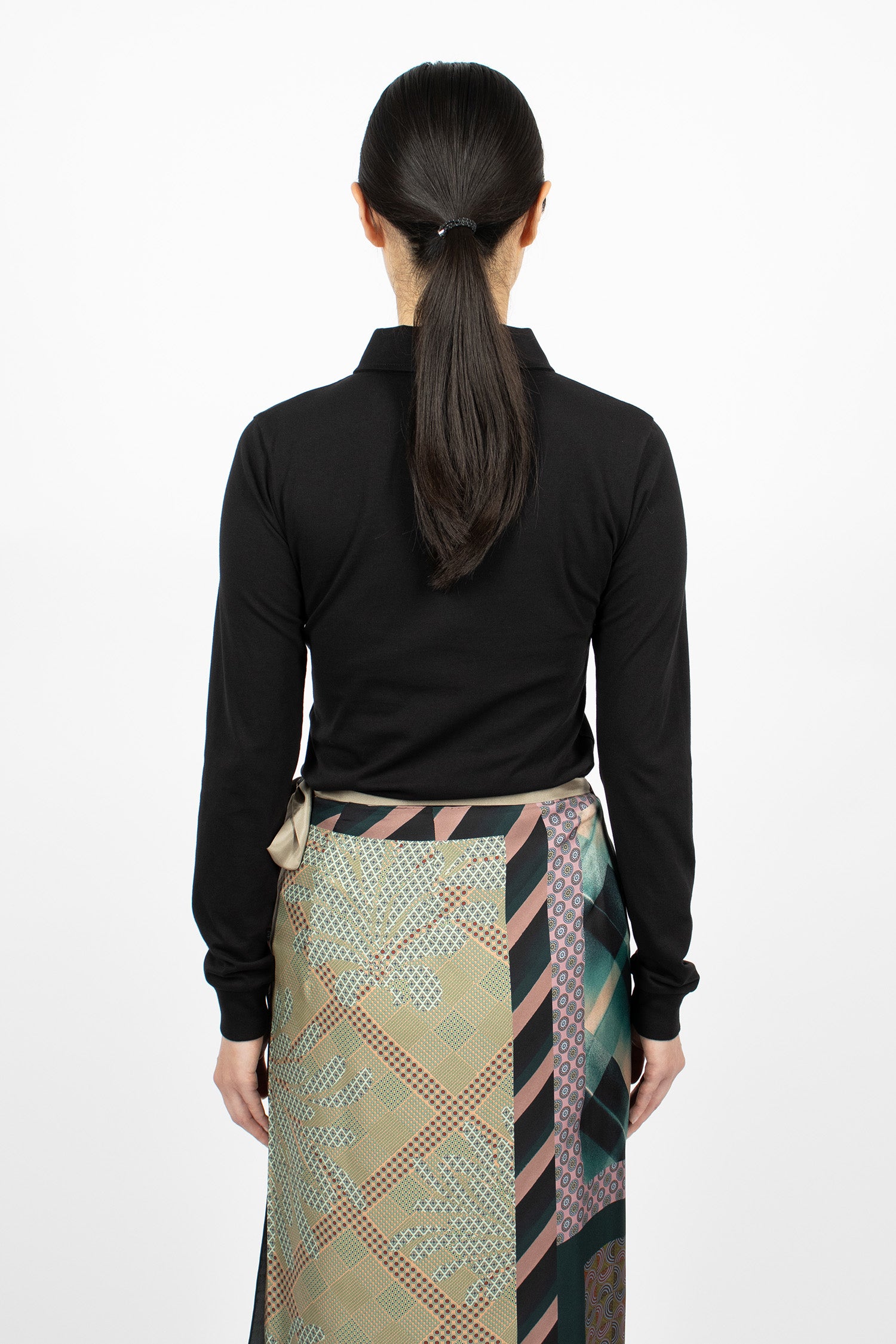 Dries Van Noten jersey polo shirt in black mid weight fluid cotton. Polo collar with half fabric-covered button front fastening, long sleeves with ribbed cuffs. Fitted style.