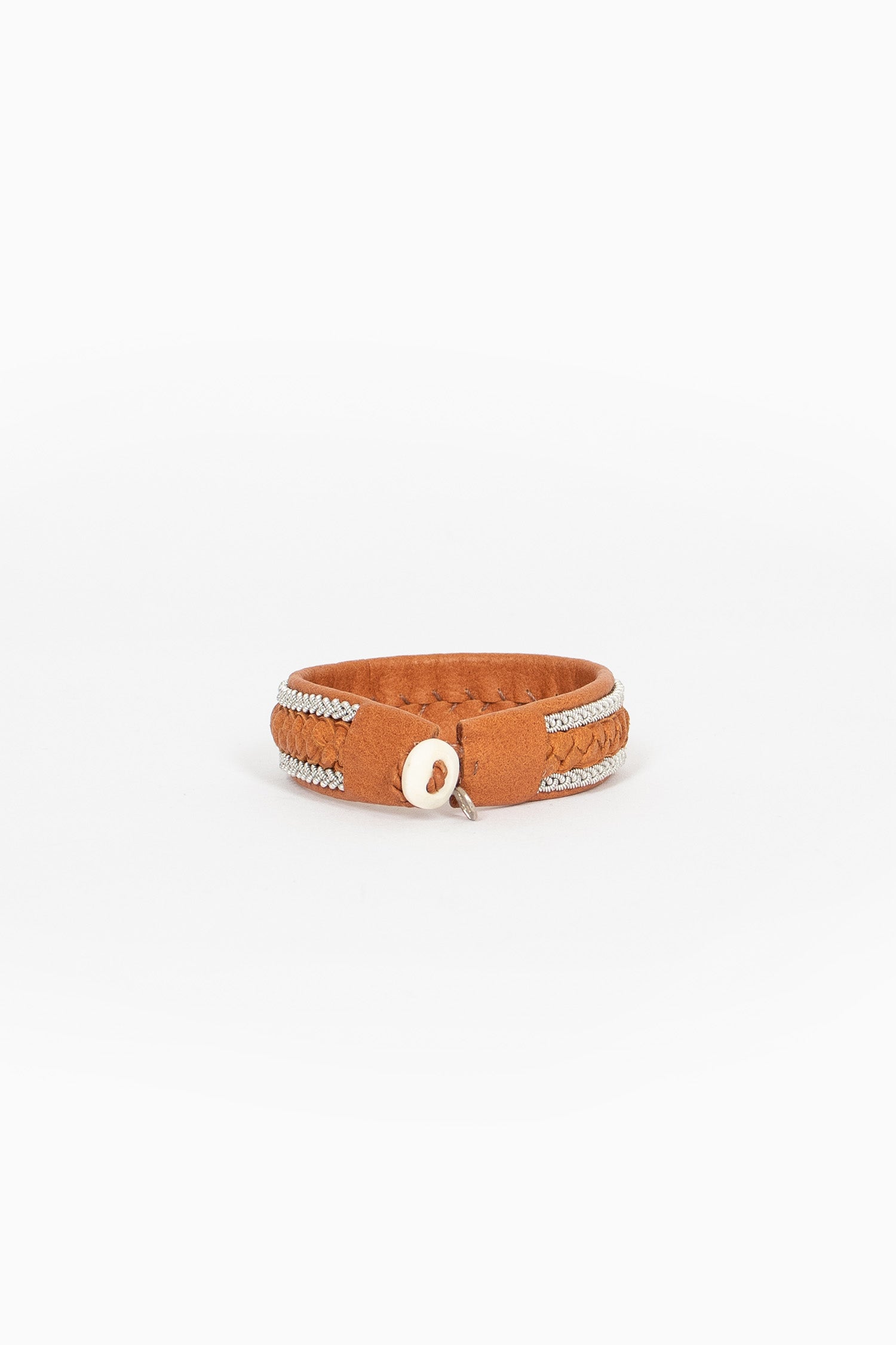 Maria Rudman Hide BS bracelet 5 in black with silver embroidery. Reindeer hide with pewter embroidery and silver beading, horn button, silver embossed tag.