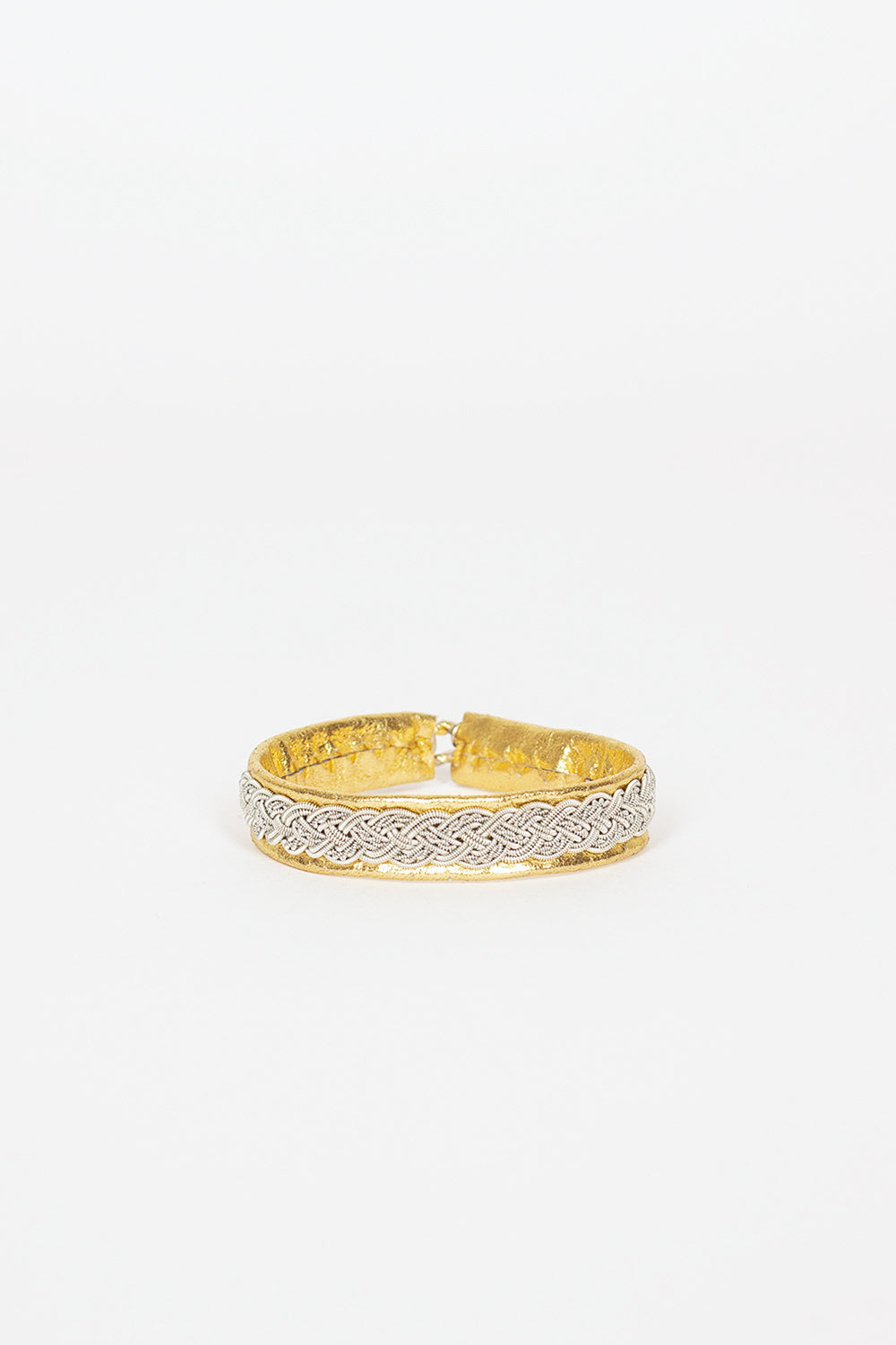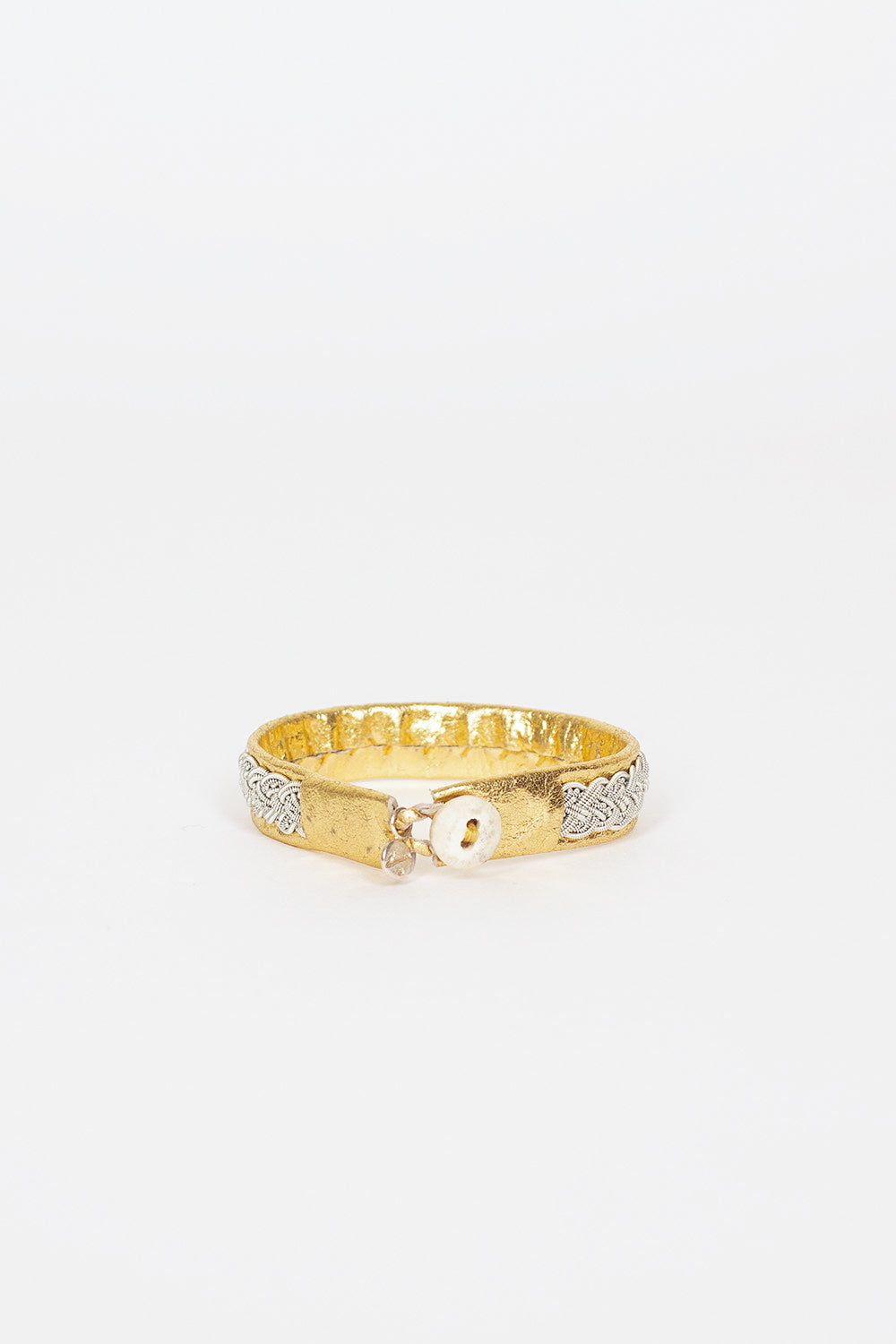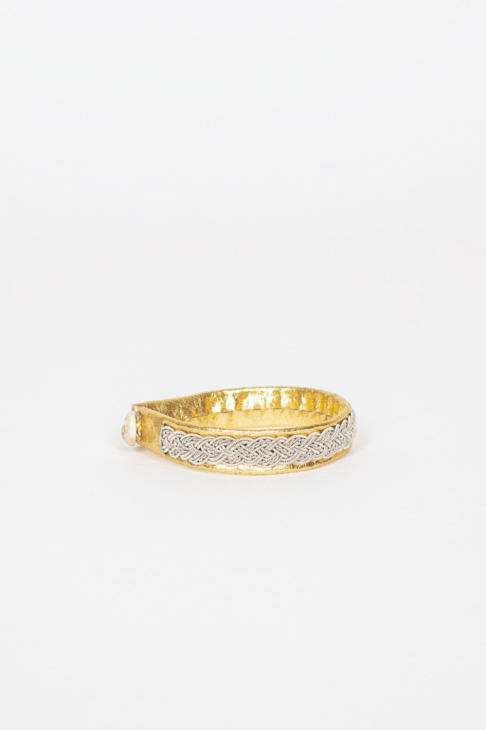 Maria Rudman hide B bracelet 1 in gold with silver embroidery. Reindeer hide with pewter embroidery, horn button and loop fastening and silver embossed tag.