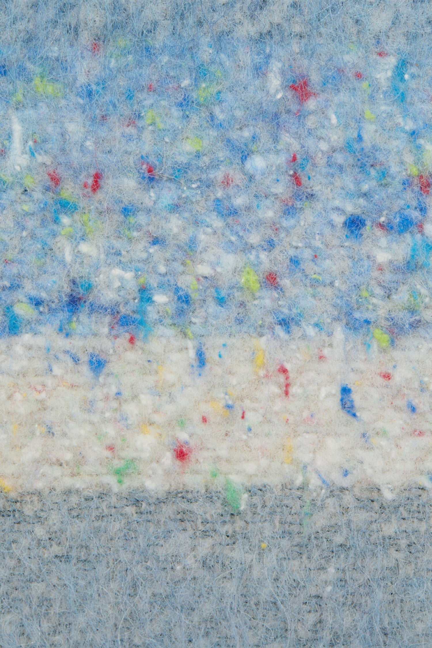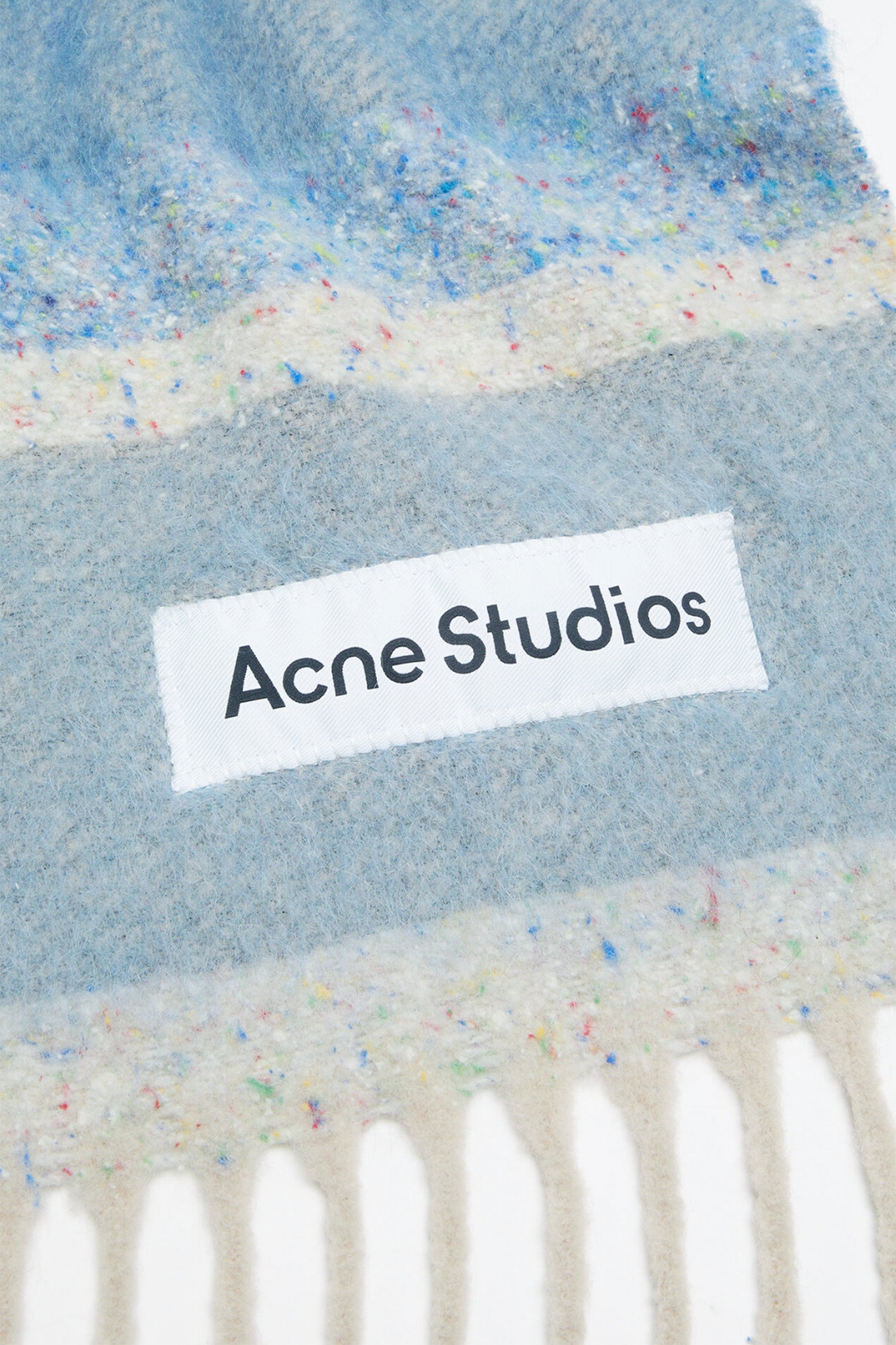 Acne Studios logo fringe scarf in denim blue wool and alpaca blend with donegal texture. Fringed ends and embroidered Acne Studios tab at base.