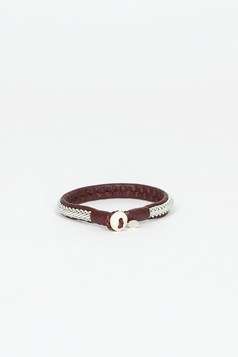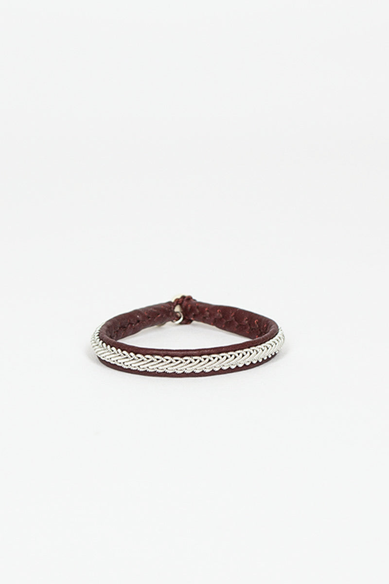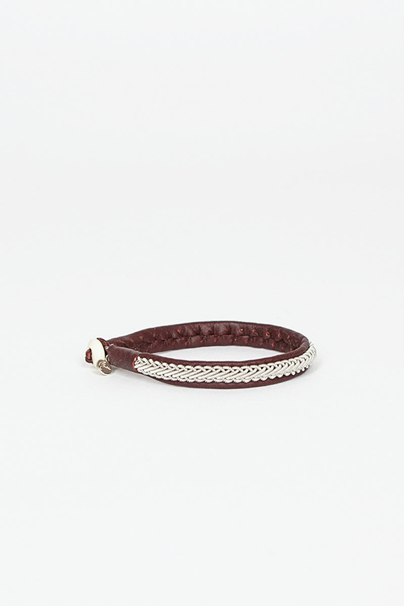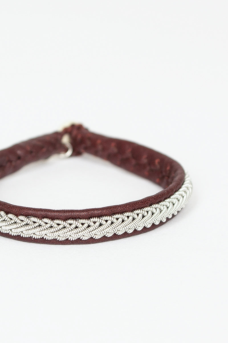 Maria Rudman ox brown hide A bracelet 2 with silver embroidery. Reindeer hide with pewter embroidery, horn button and loop fastening and silver embossed tag.