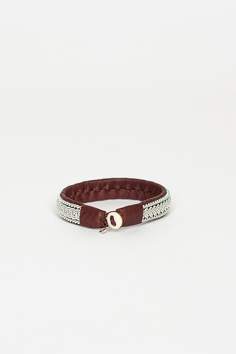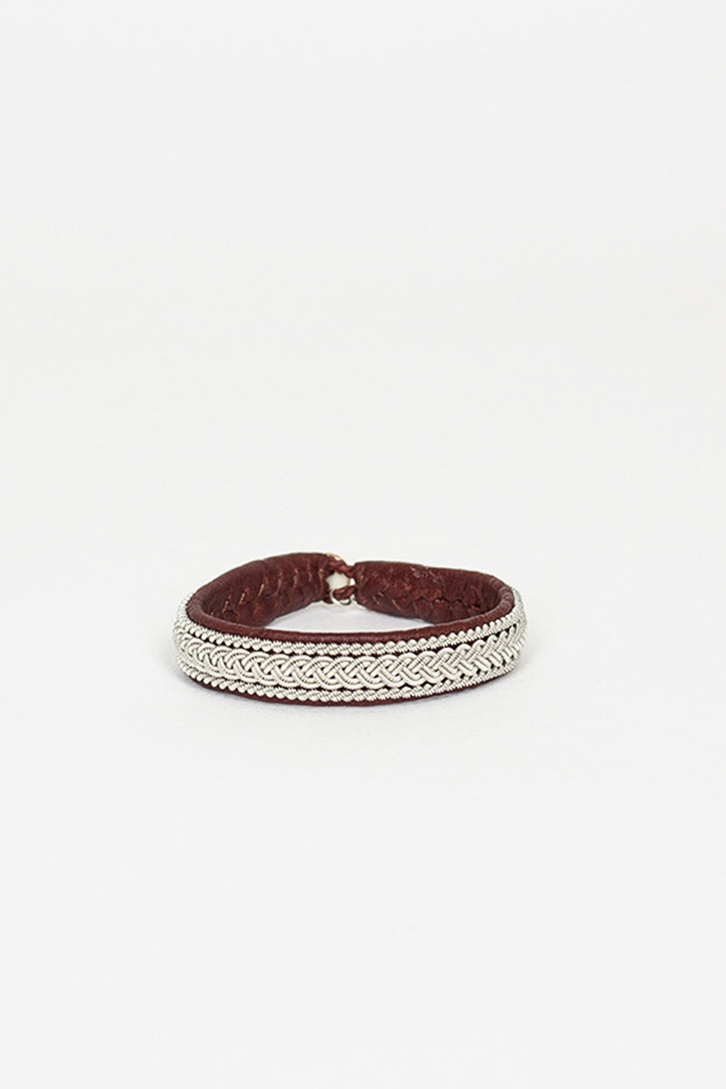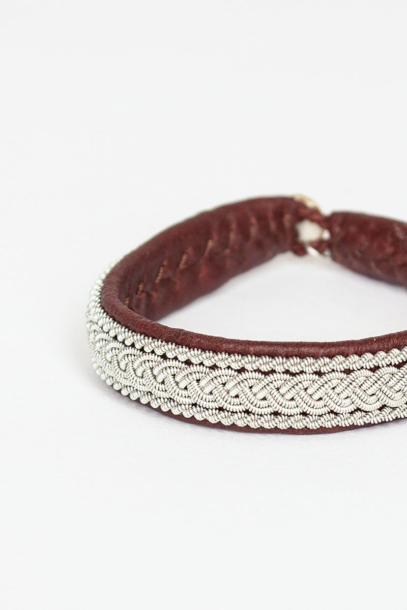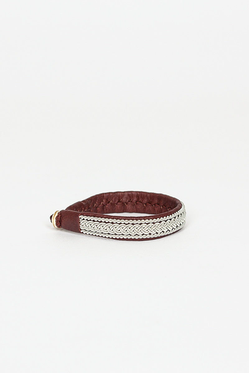 Maria Rudman hide B bracelet 1 in ox brown with silver embroidery. Reindeer hide with pewter embroidery, horn button, silver embossed tag.
