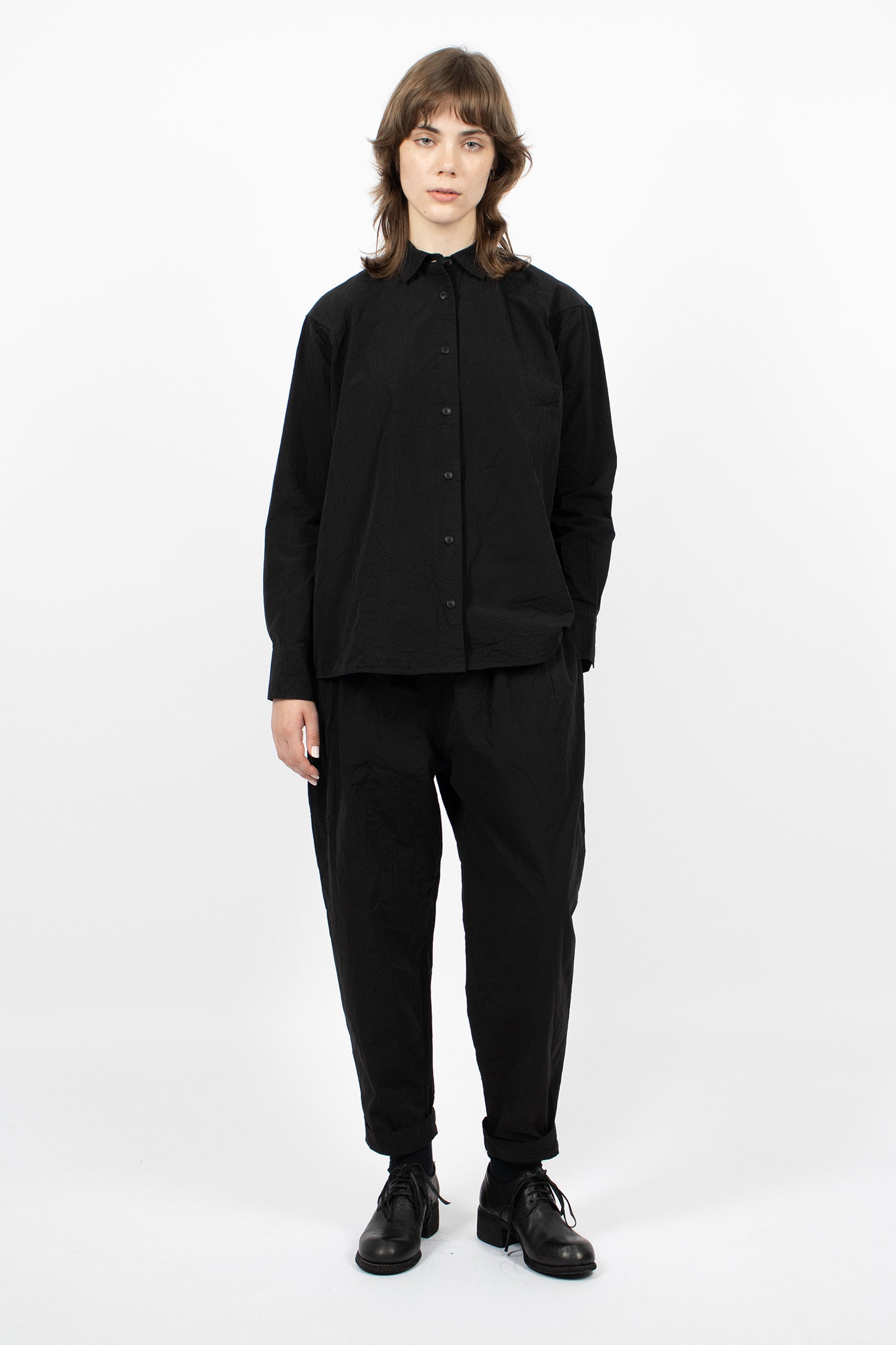 Casey Casey Drays shirt in pitch black paper cotton. Collar with tonal Corozo button front fastening, dropped shoulder, raglan long sleeve with button cuff. Back pleats. Straight hem and boxy fit. Garment washed.
