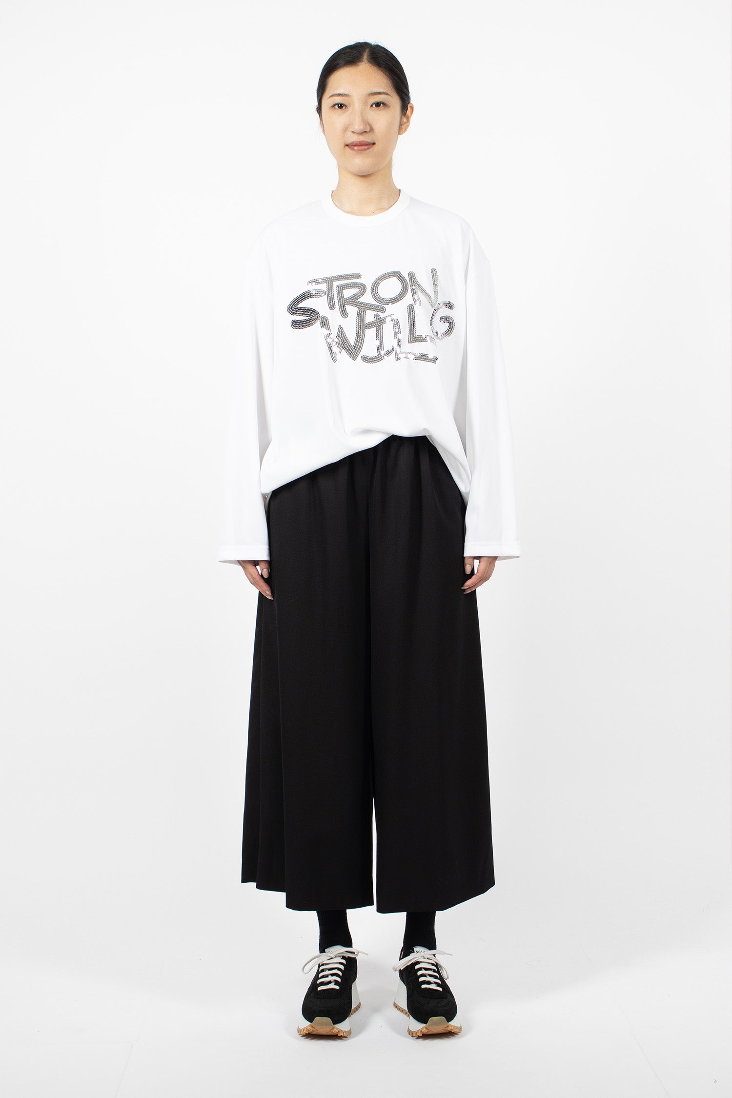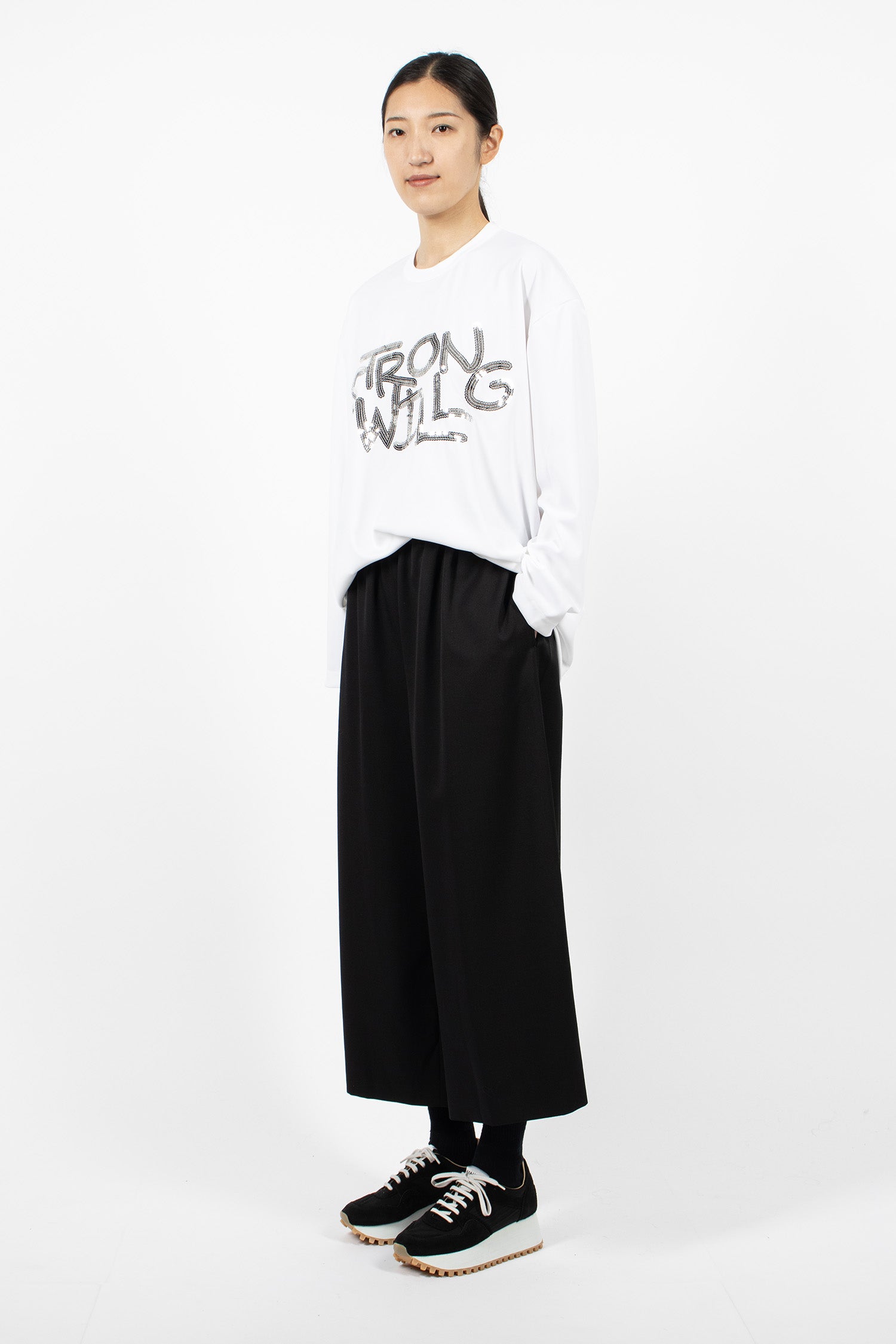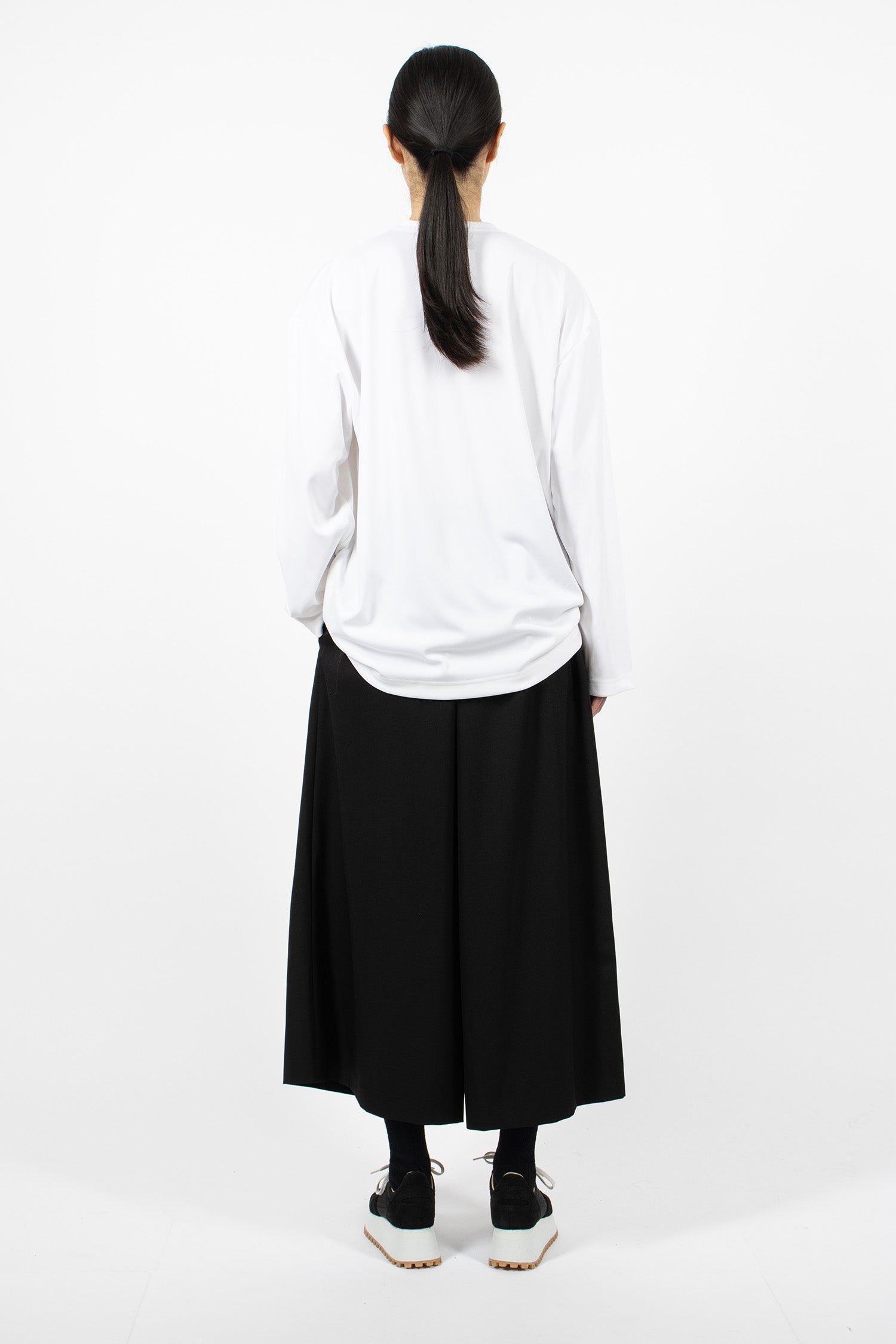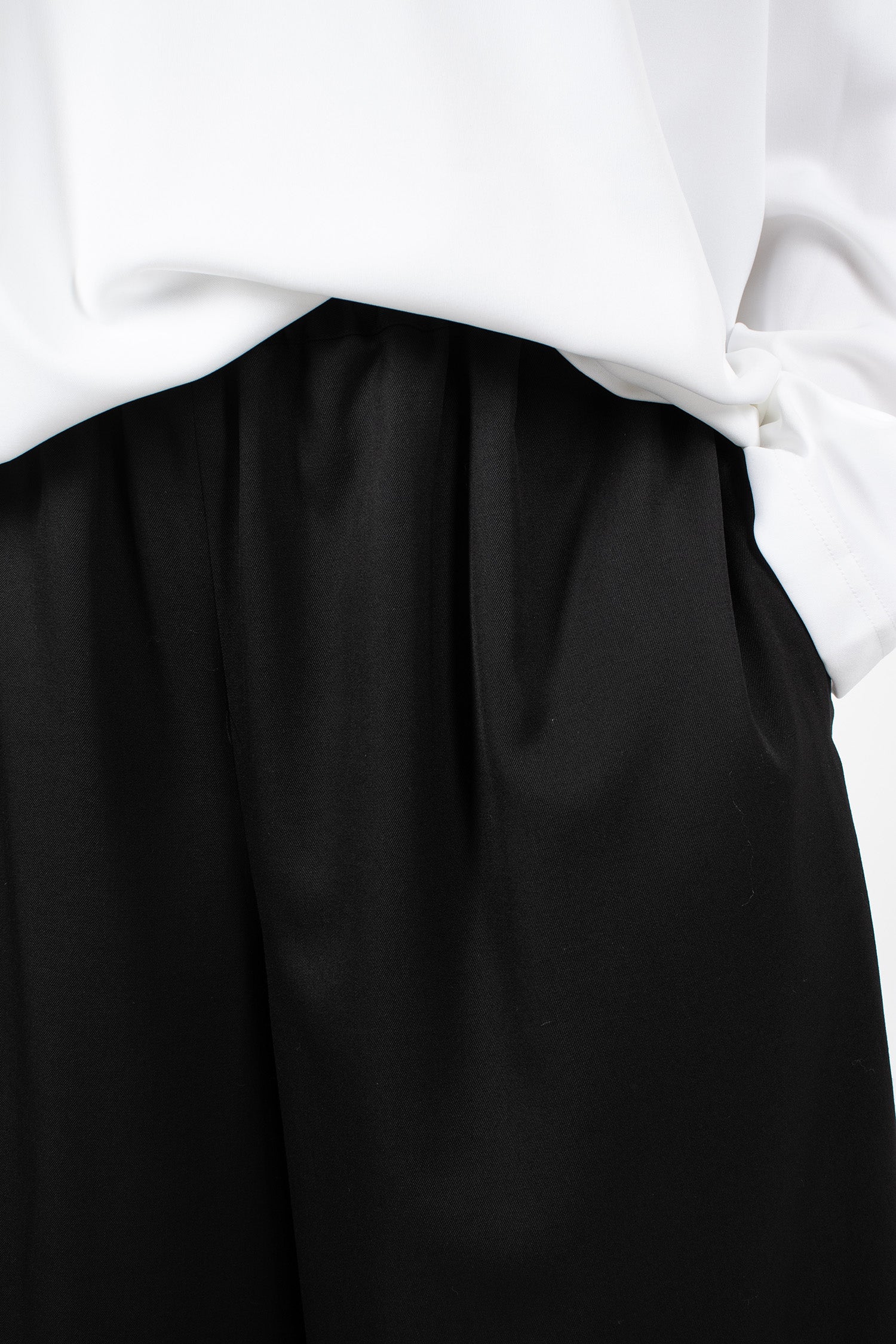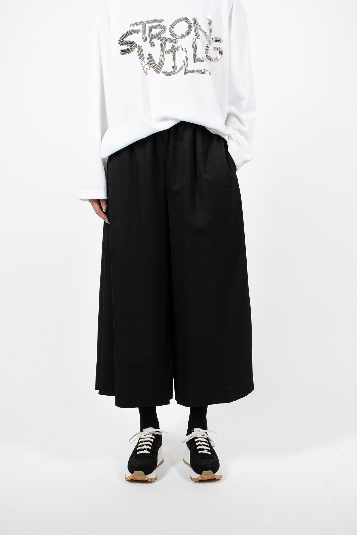Comme Des Garçons Comme Des Garçons wide leg pant in black wool. Elasticated waistband with drawstring fastening. Wide straight leg with side seam pocket. Cropped length.