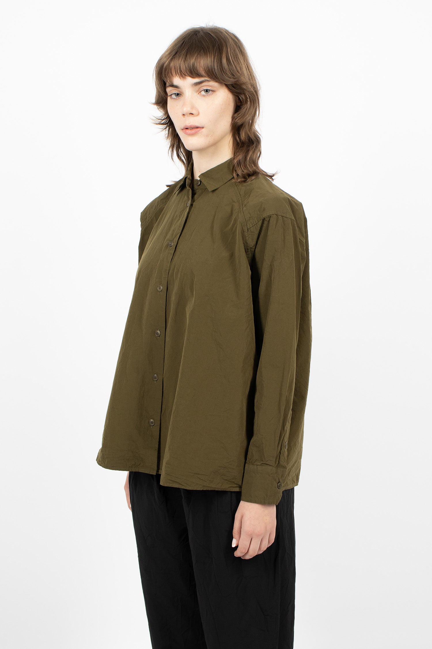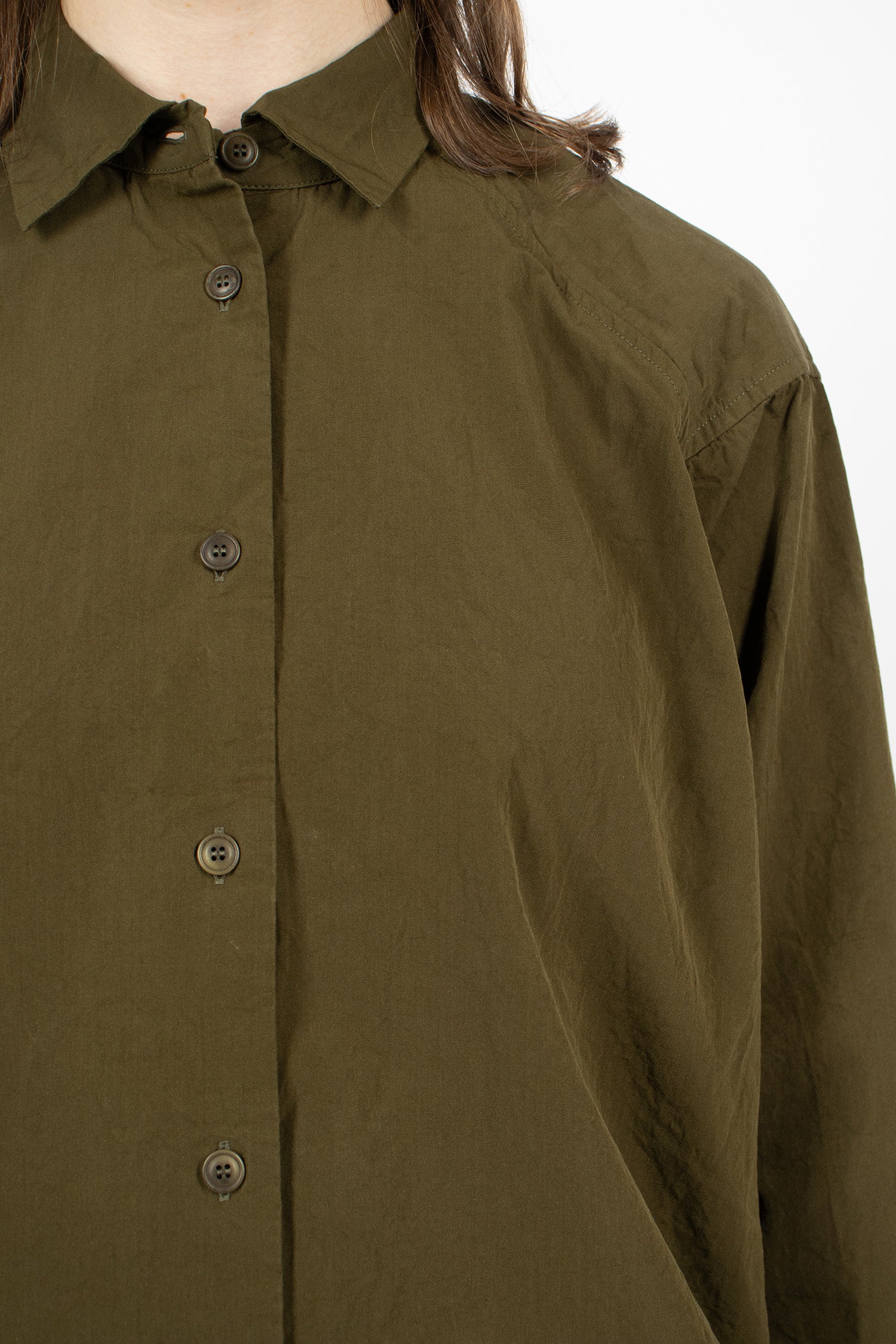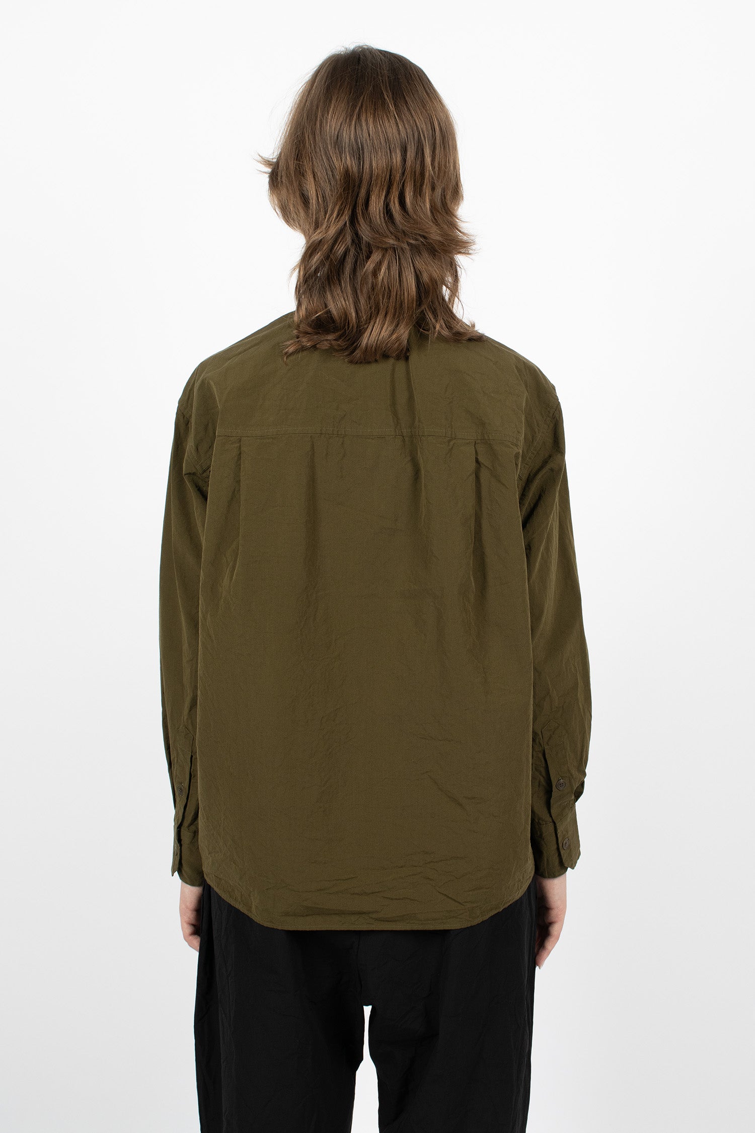 Casey Casey Drays shirt in green lake paper cotton. Collar with tonal Corozo button front fastening, dropped shoulder, raglan long sleeve with button cuff. Back pleats. Straight hem and boxy fit. Garment washed.
