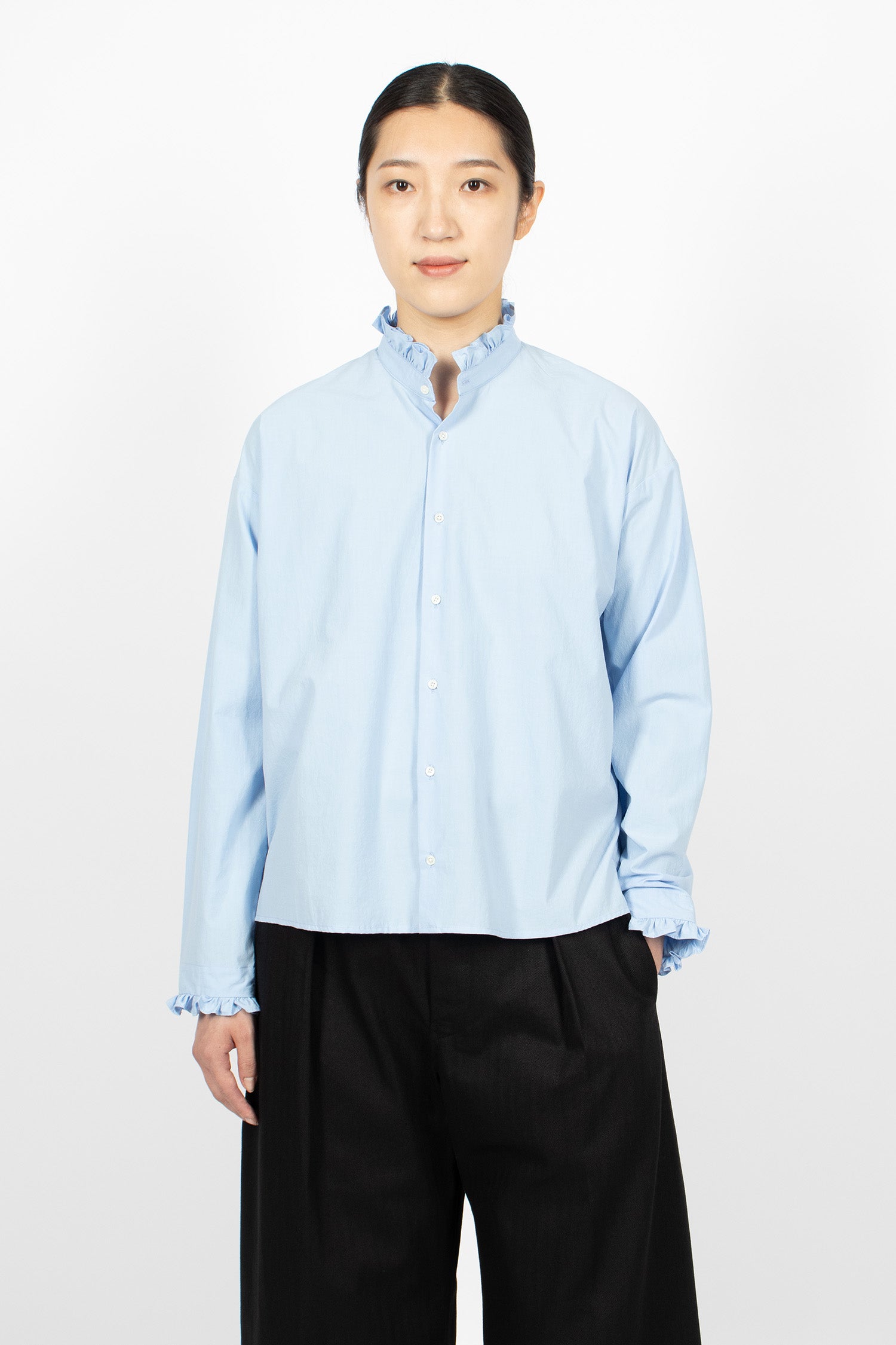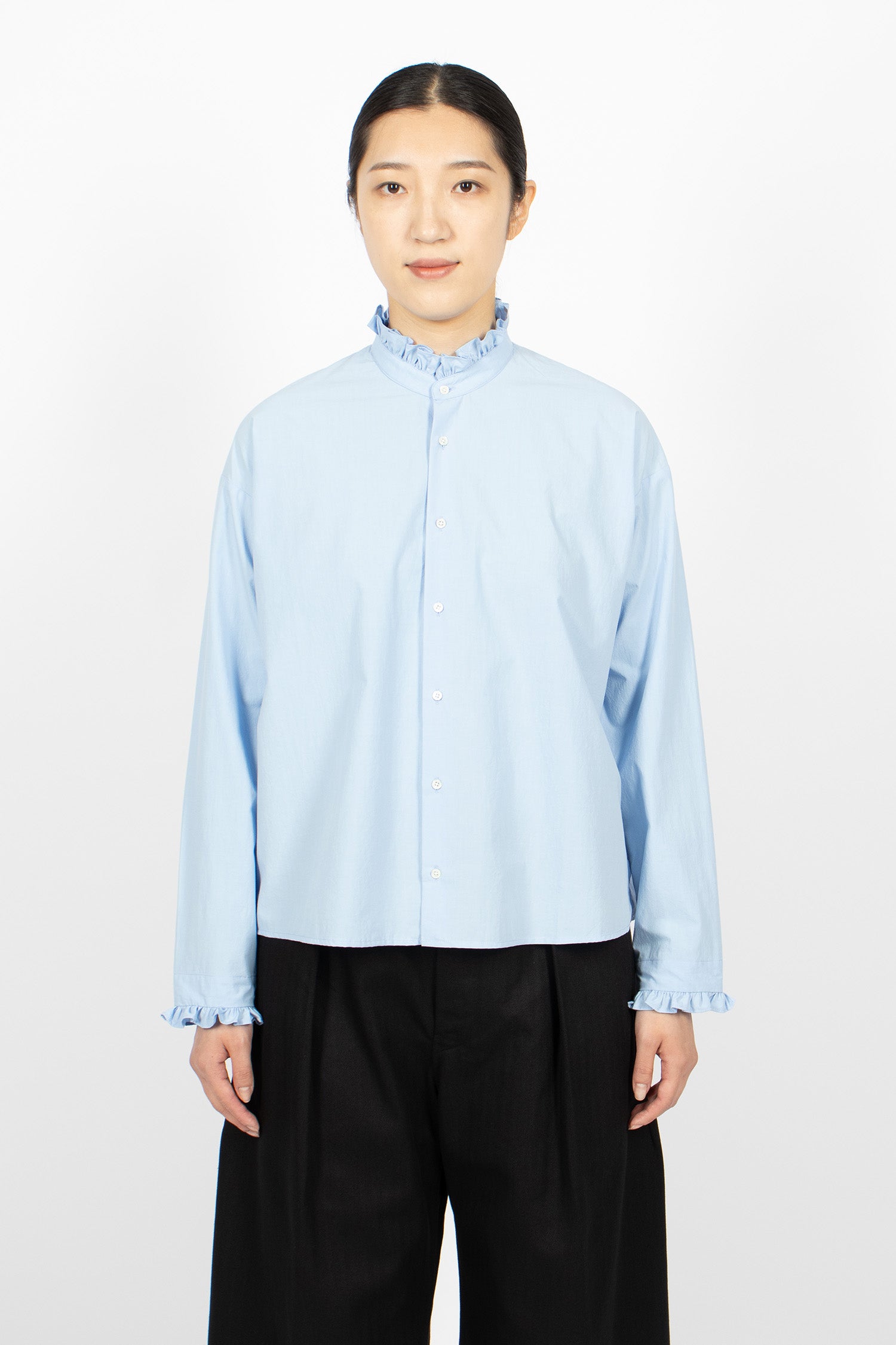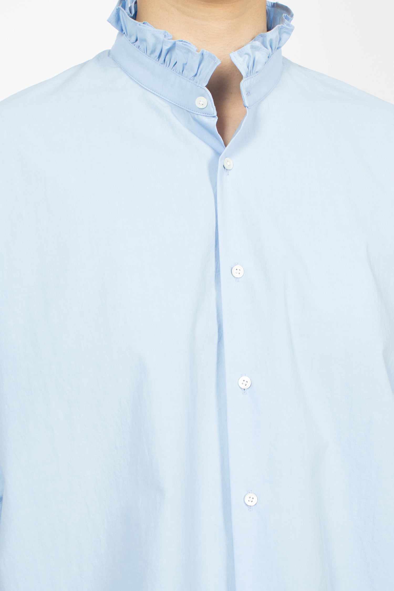 École de Curiosités Babette shirt in light blue. High ruffled collar with button front fastening. Dropped shoulder, long sleeves and ruffle-trimmed cuffs. Straight hem with side splits. Relaxed, boxy fit.