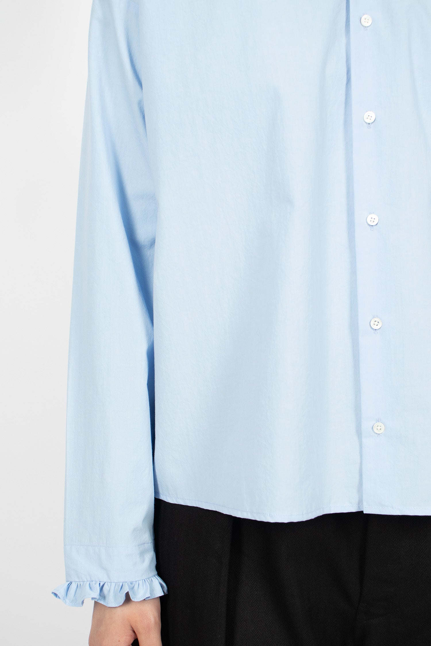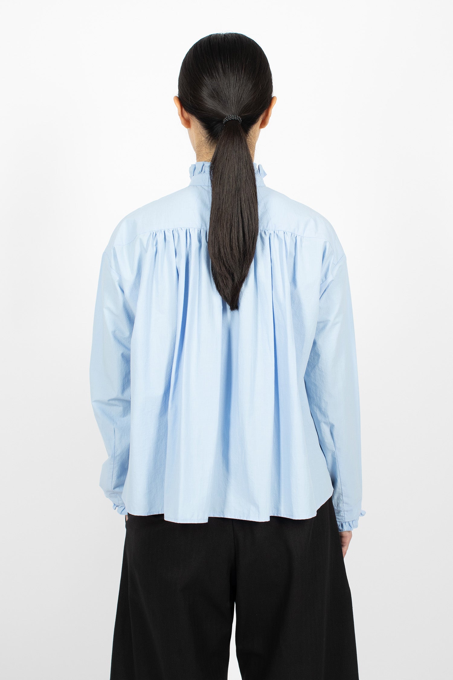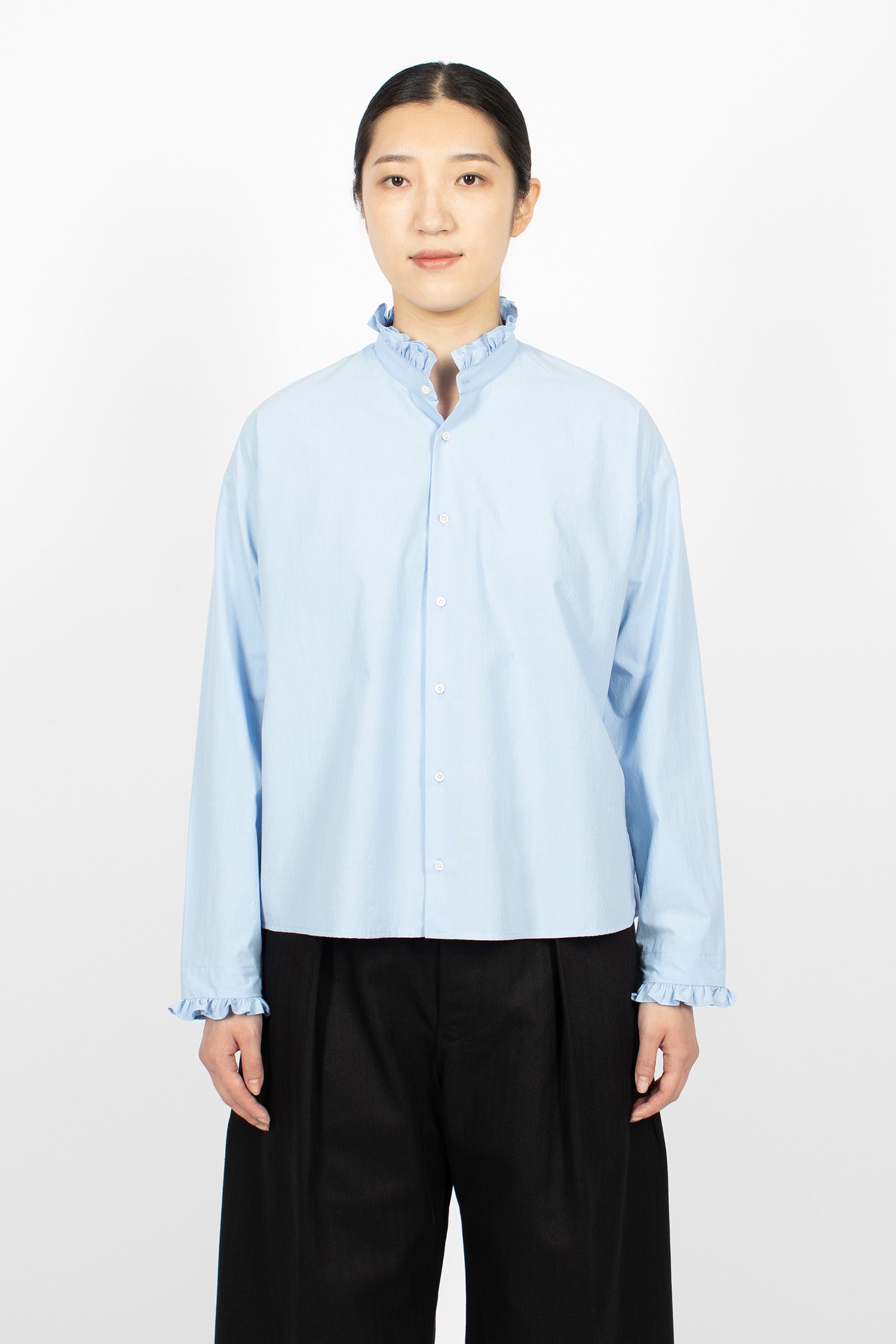 École de Curiosités Babette shirt in light blue. High ruffled collar with button front fastening. Dropped shoulder, long sleeves and ruffle-trimmed cuffs. Straight hem with side splits. Relaxed, boxy fit.