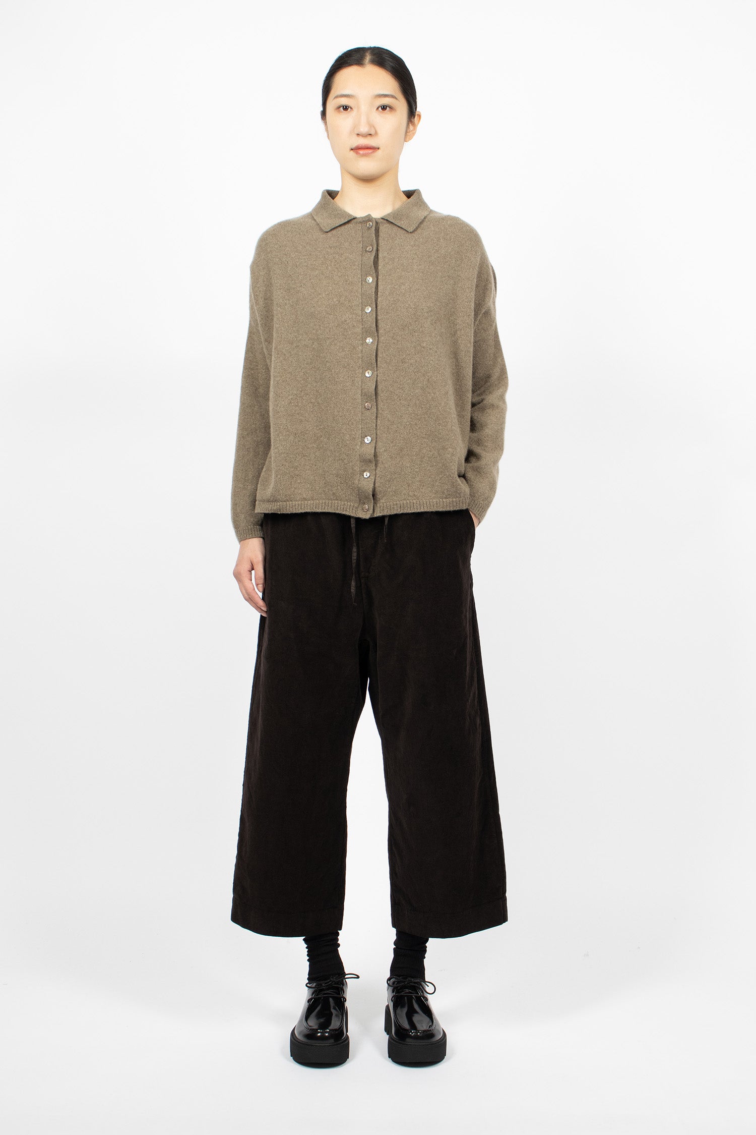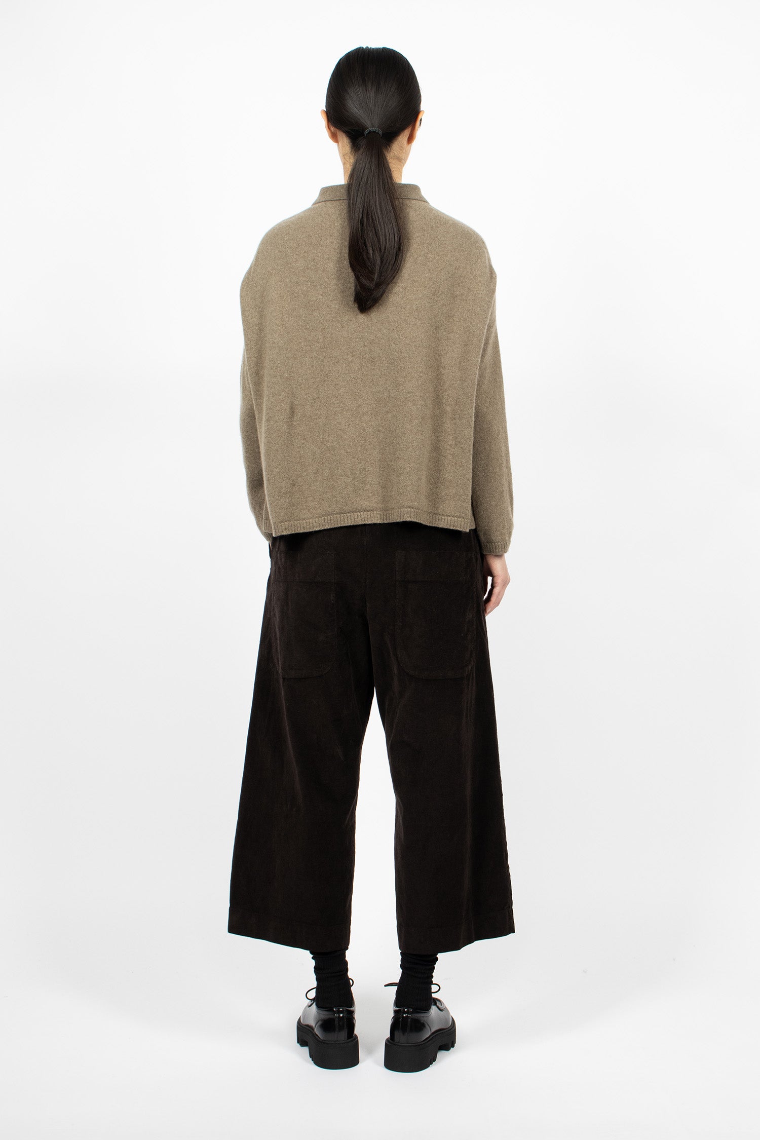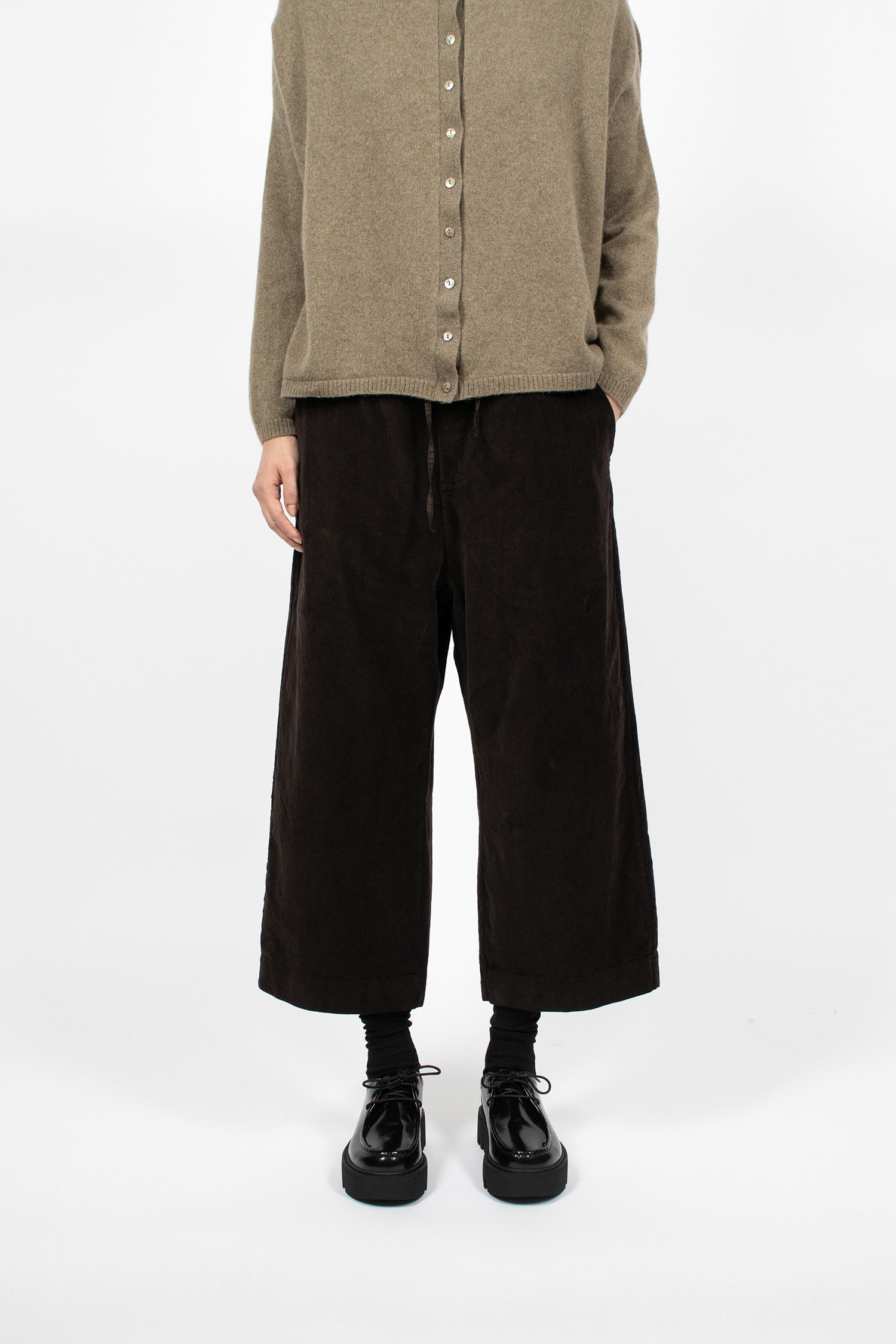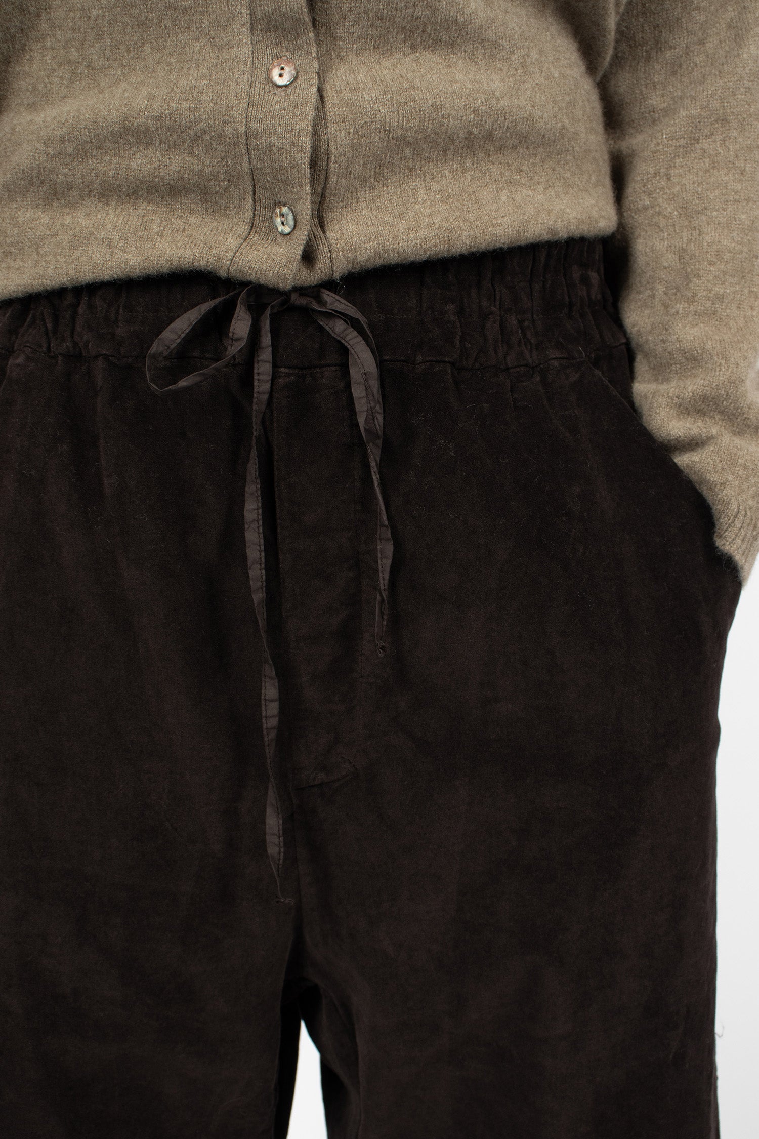 Album di Famiglia 23_206 velvet wide and short trousers in chocolate. Pull-on trousers with elasticated waistband and tonal drawstring to adjust fit. Dropped rise. Side pockets and back patch pockets. Straight cropped leg. Loose, relaxed fit.