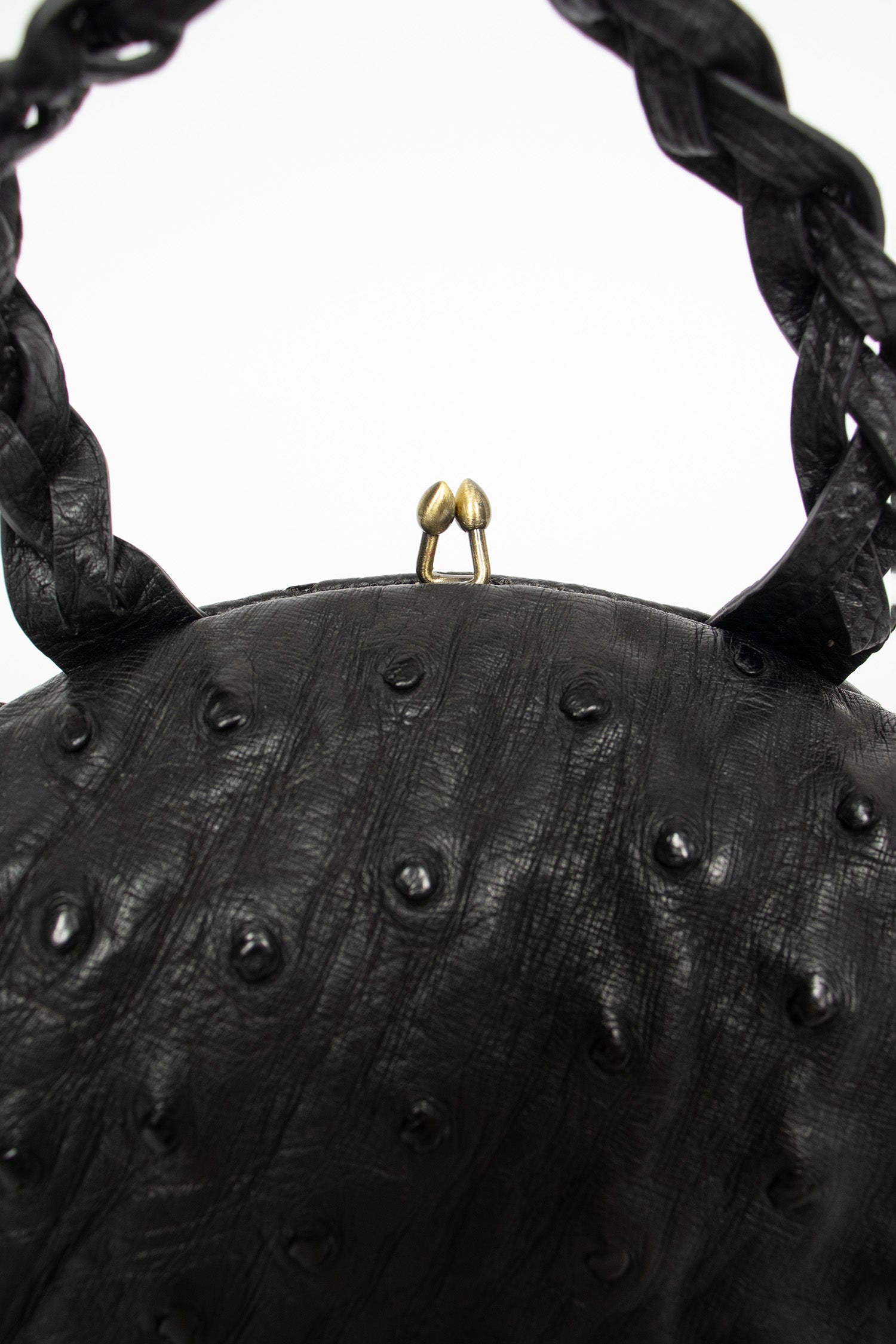 VISVIM leather purse in black Japanese ostrich leather. Detachable crossbody strap, single leather handle, fully lined with inner patch pocket.