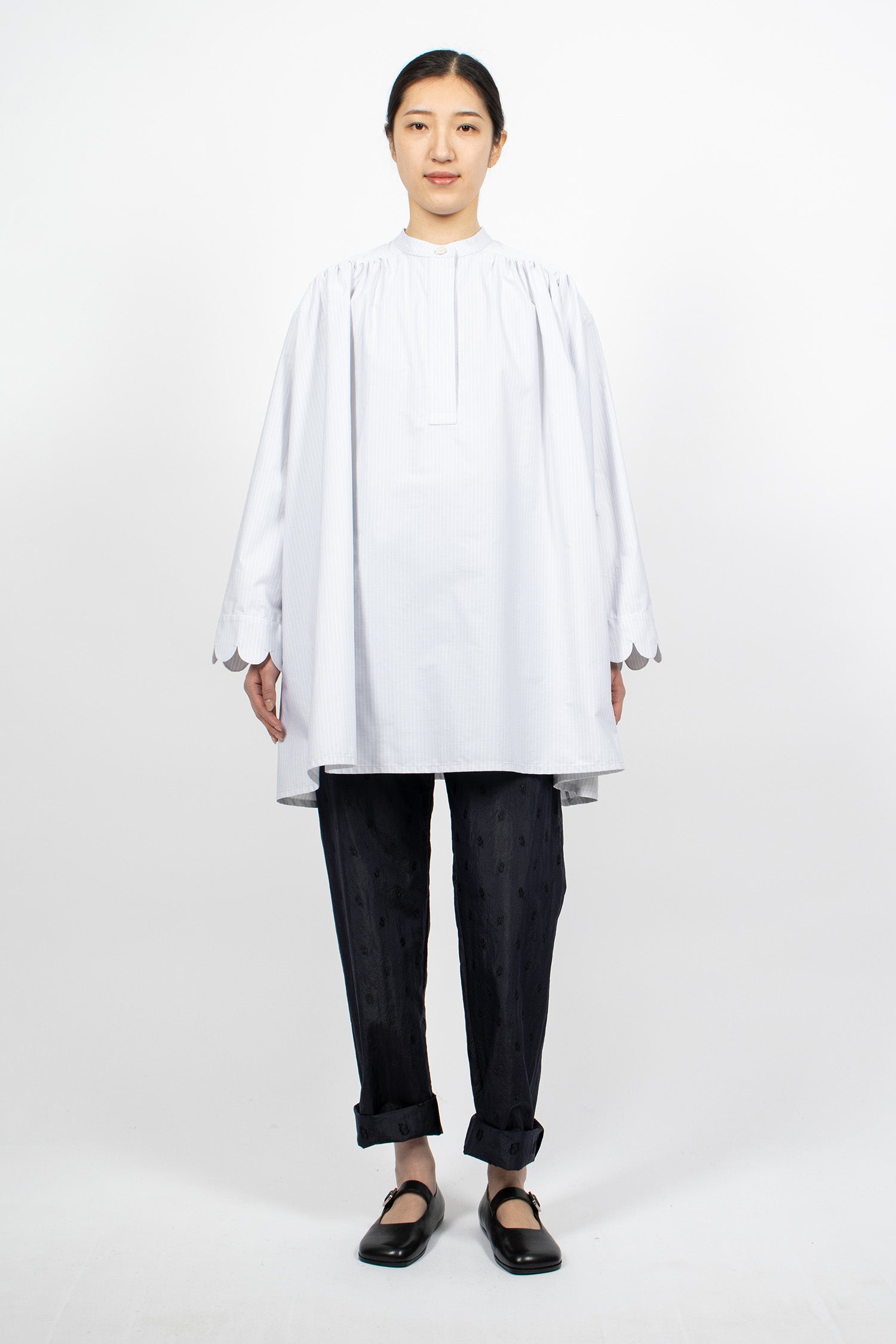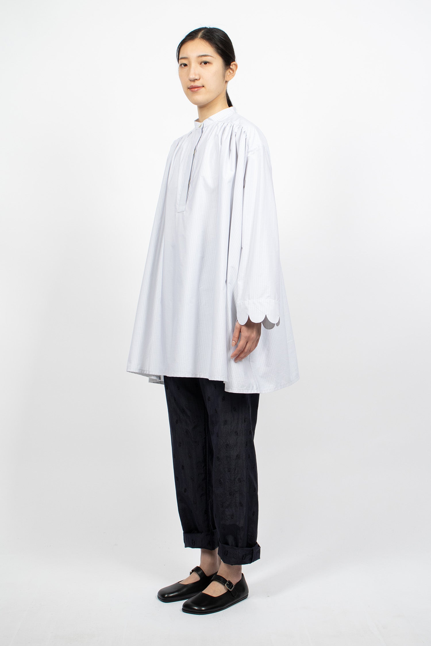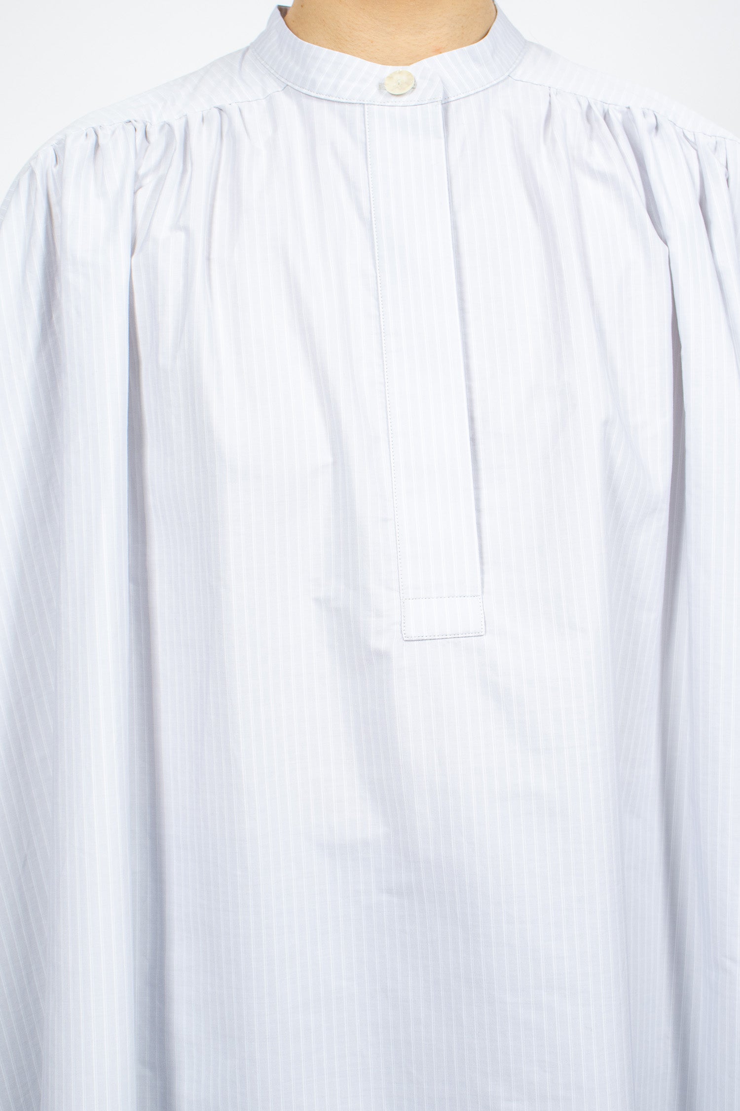 Eleph All dress in light blue with white stripe. Banded collar with concealed button placket fastening, dropped shoulder with gathered detail, long sleeve with scalloped cuff. Dropped back with gathered detailing. Side seam pockets. Oversized fit.