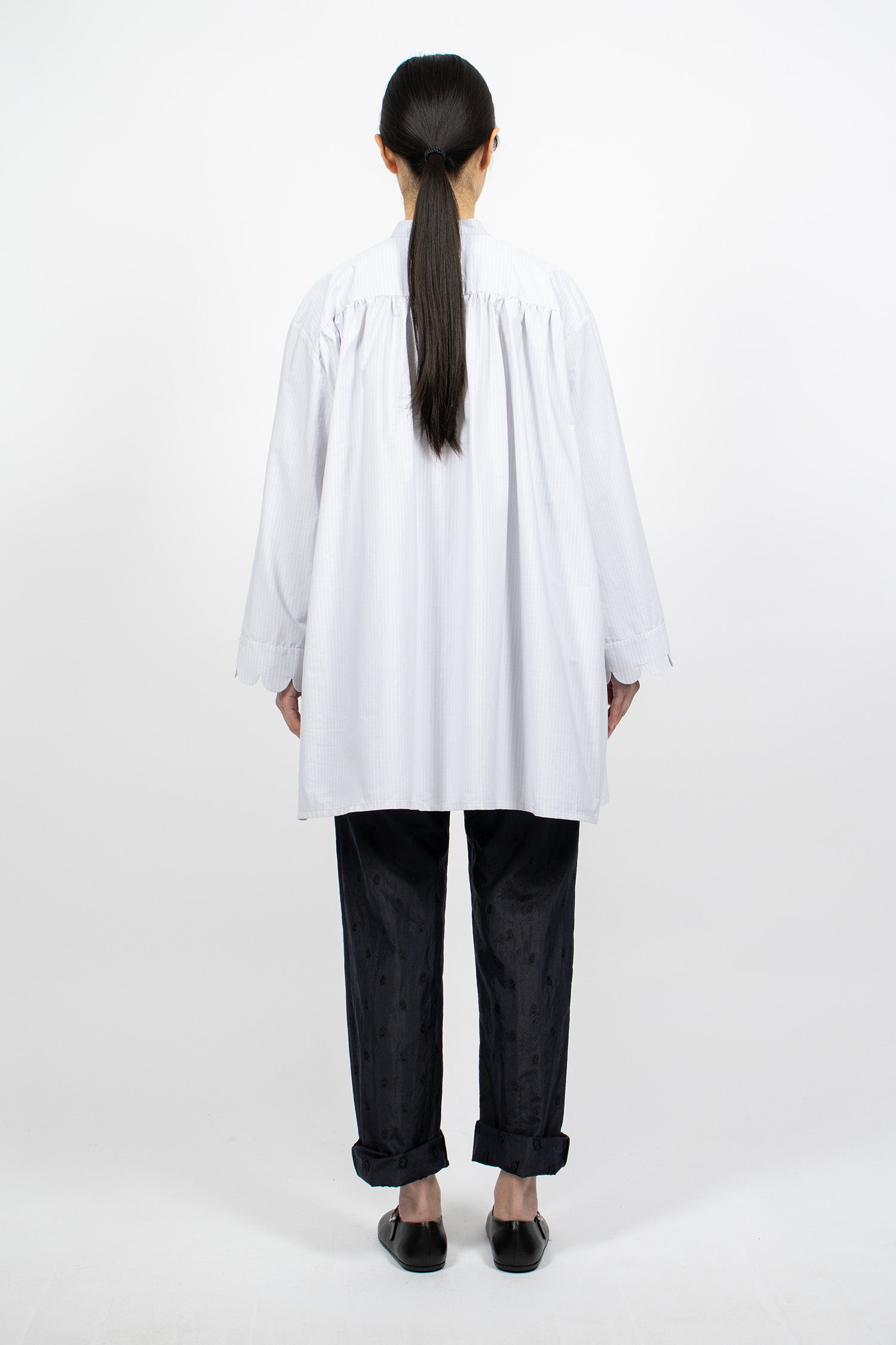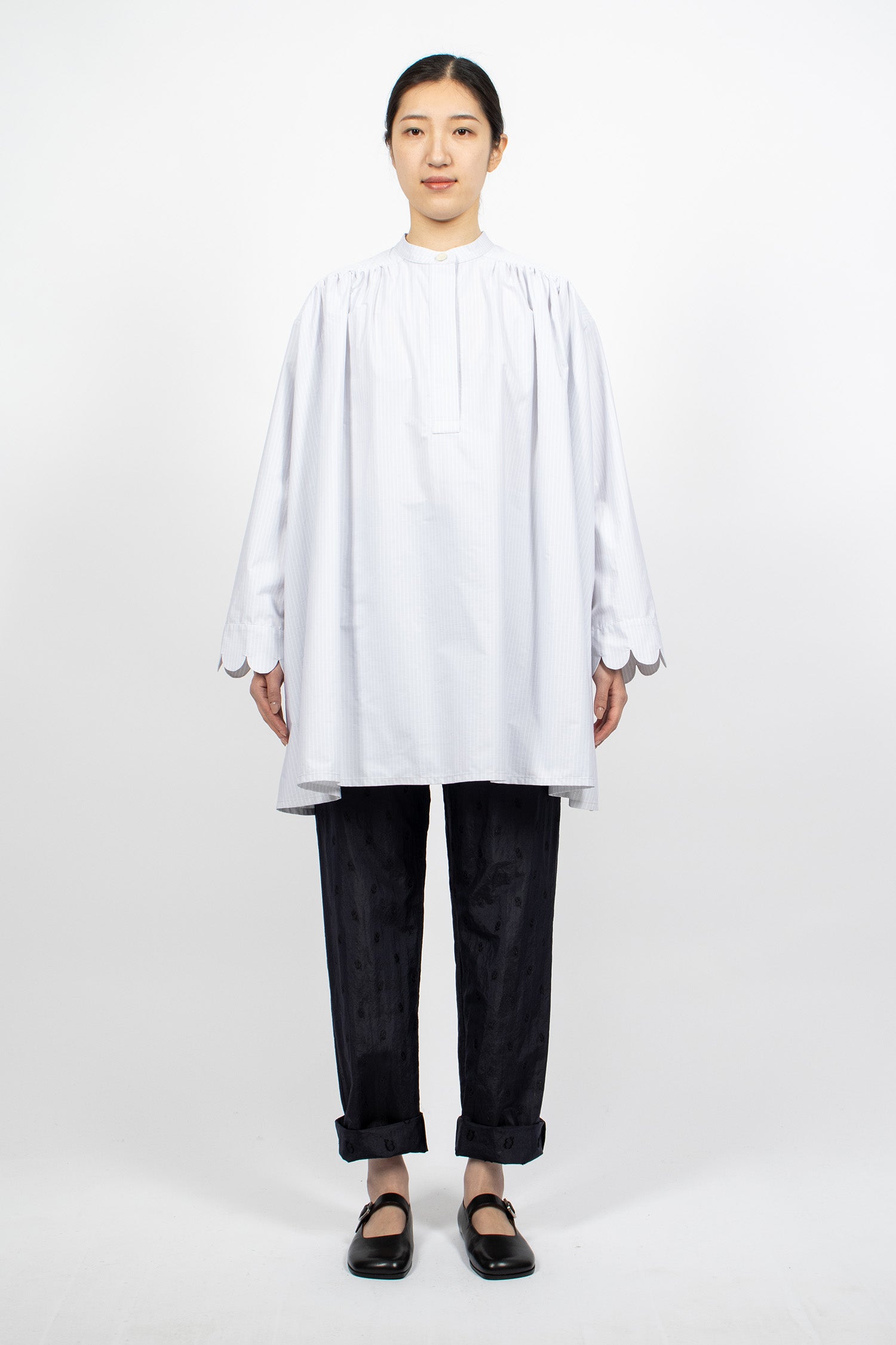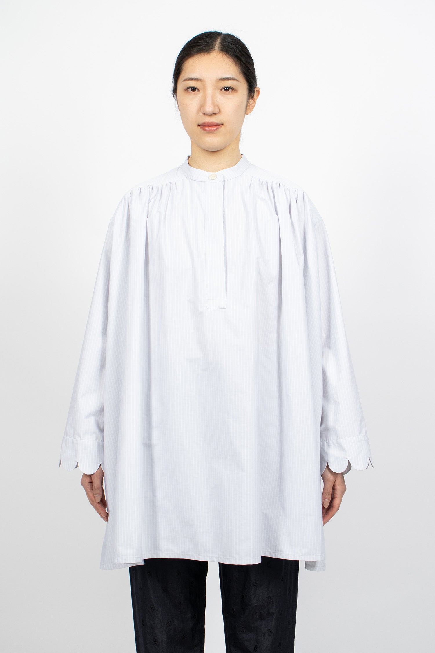 Eleph All dress in light blue with white stripe. Banded collar with concealed button placket fastening, dropped shoulder with gathered detail, long sleeve with scalloped cuff. Dropped back with gathered detailing. Side seam pockets. Oversized fit.