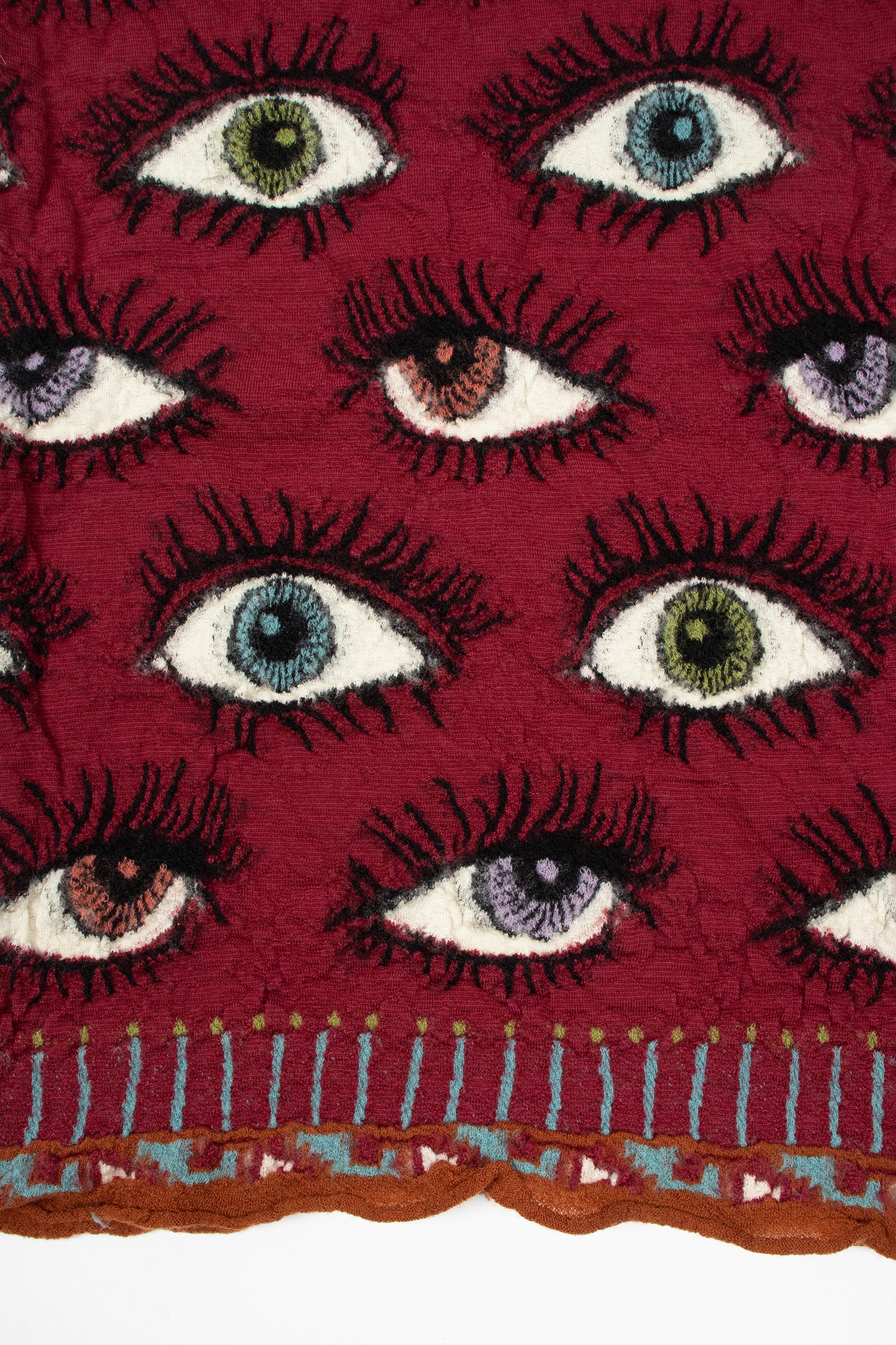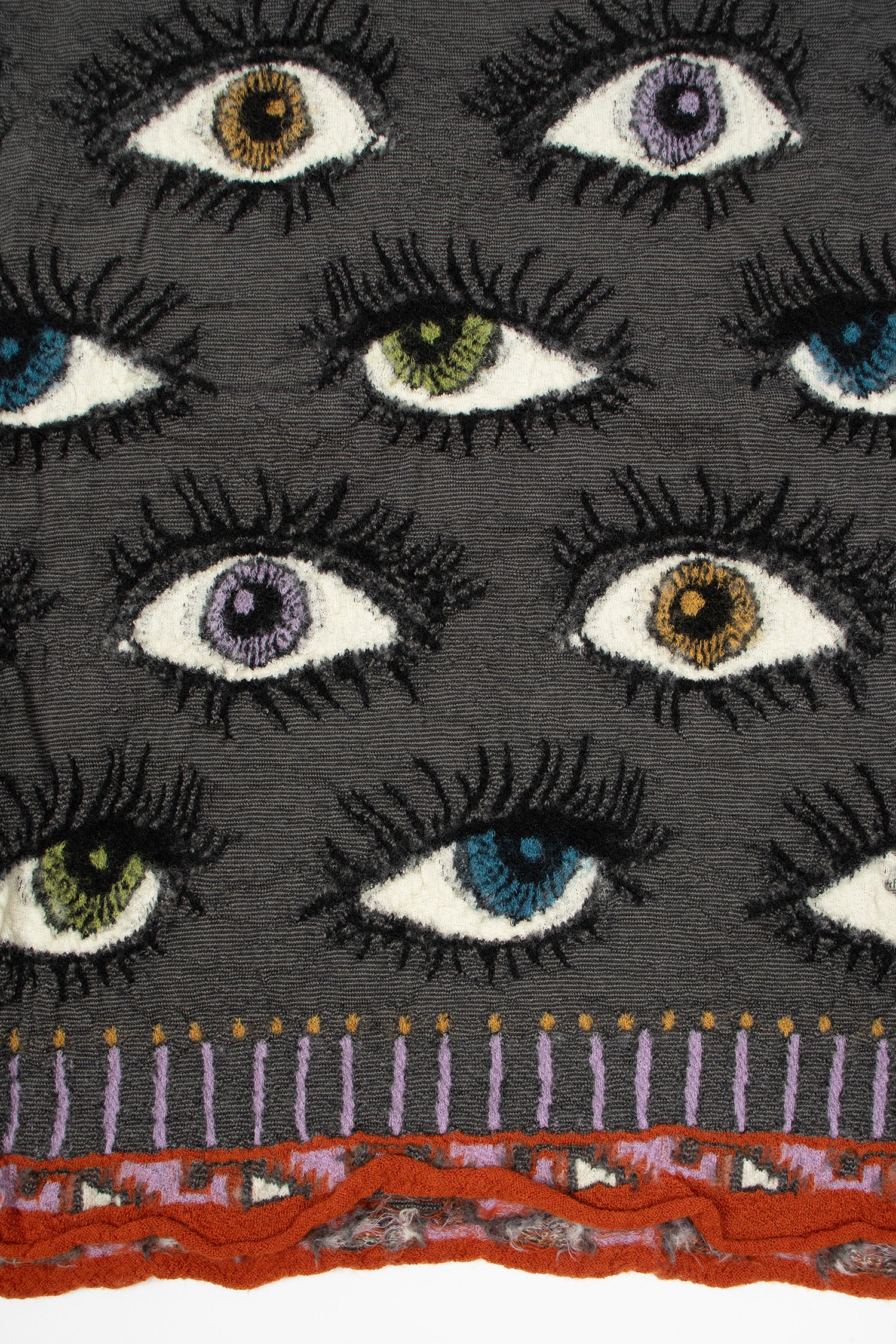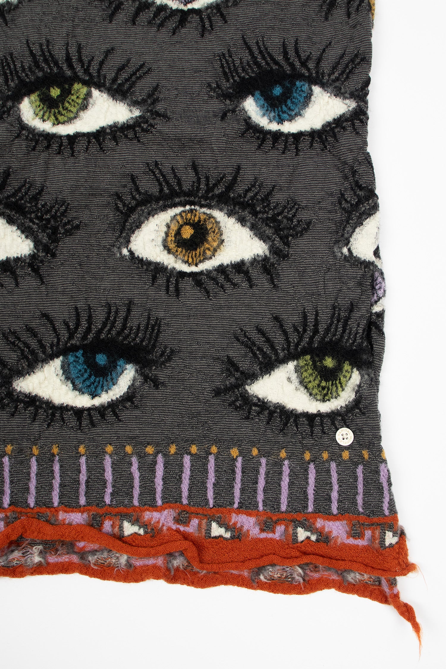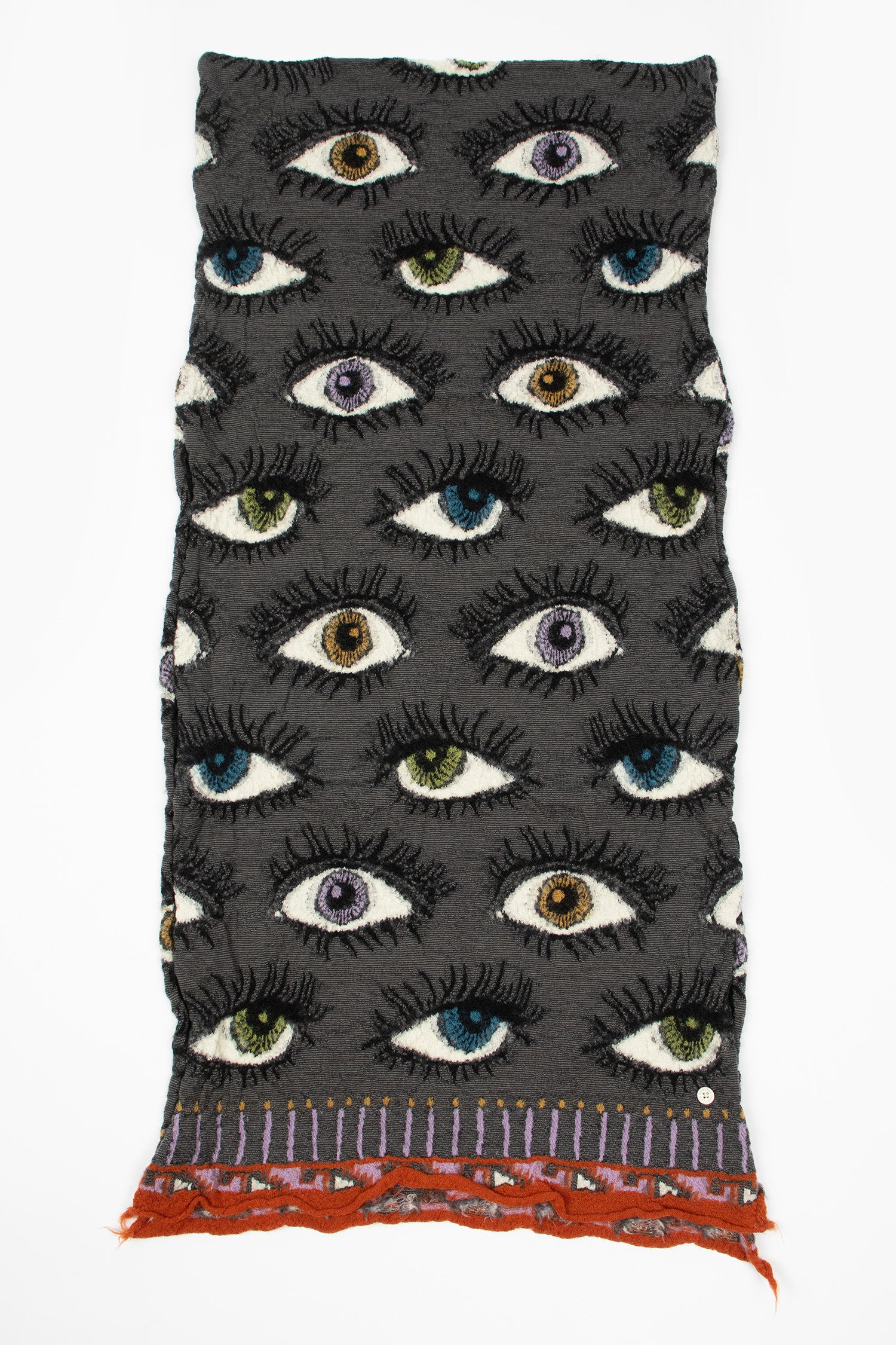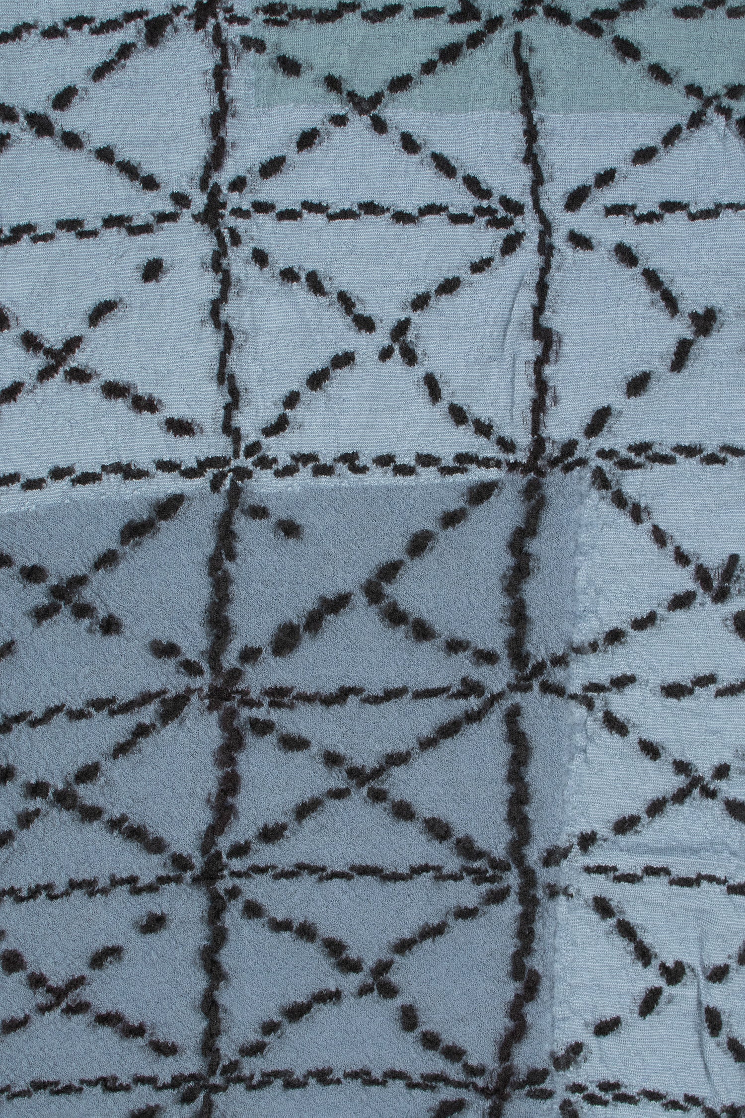 Kapital happy scarf in sax wool with patchwork Sashiko pattern throughout. Full length rectangular shape with rolled edges and Kapital custom button.