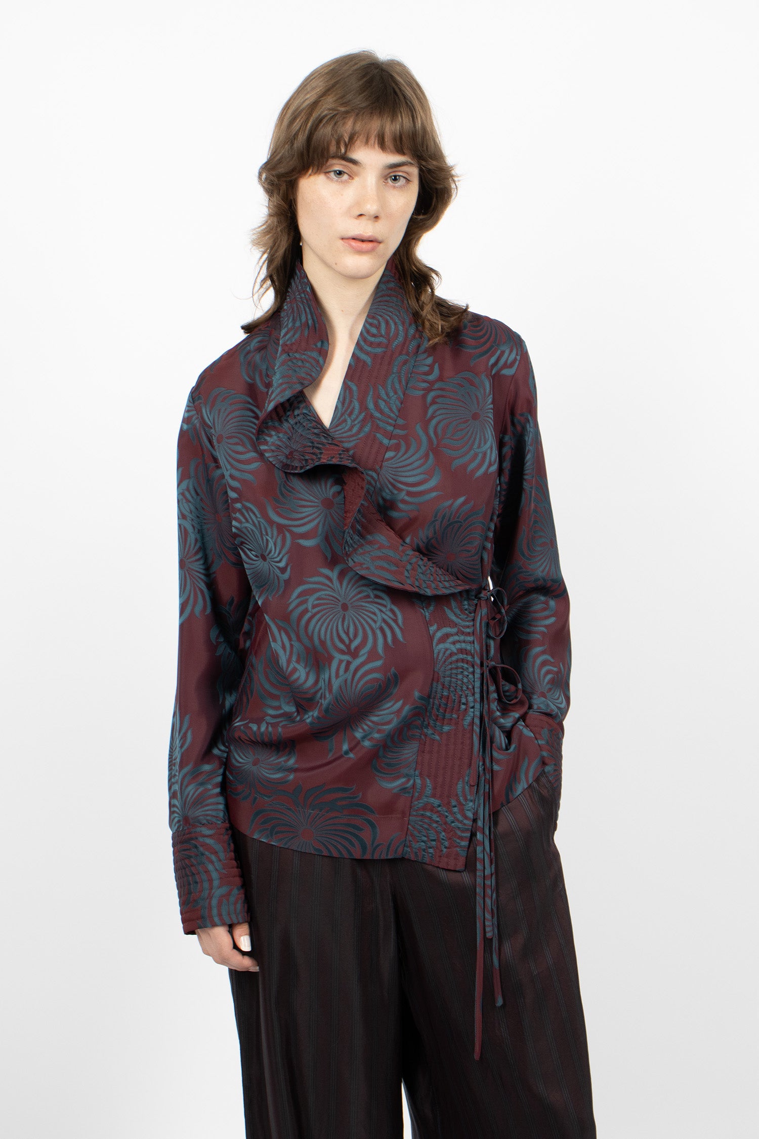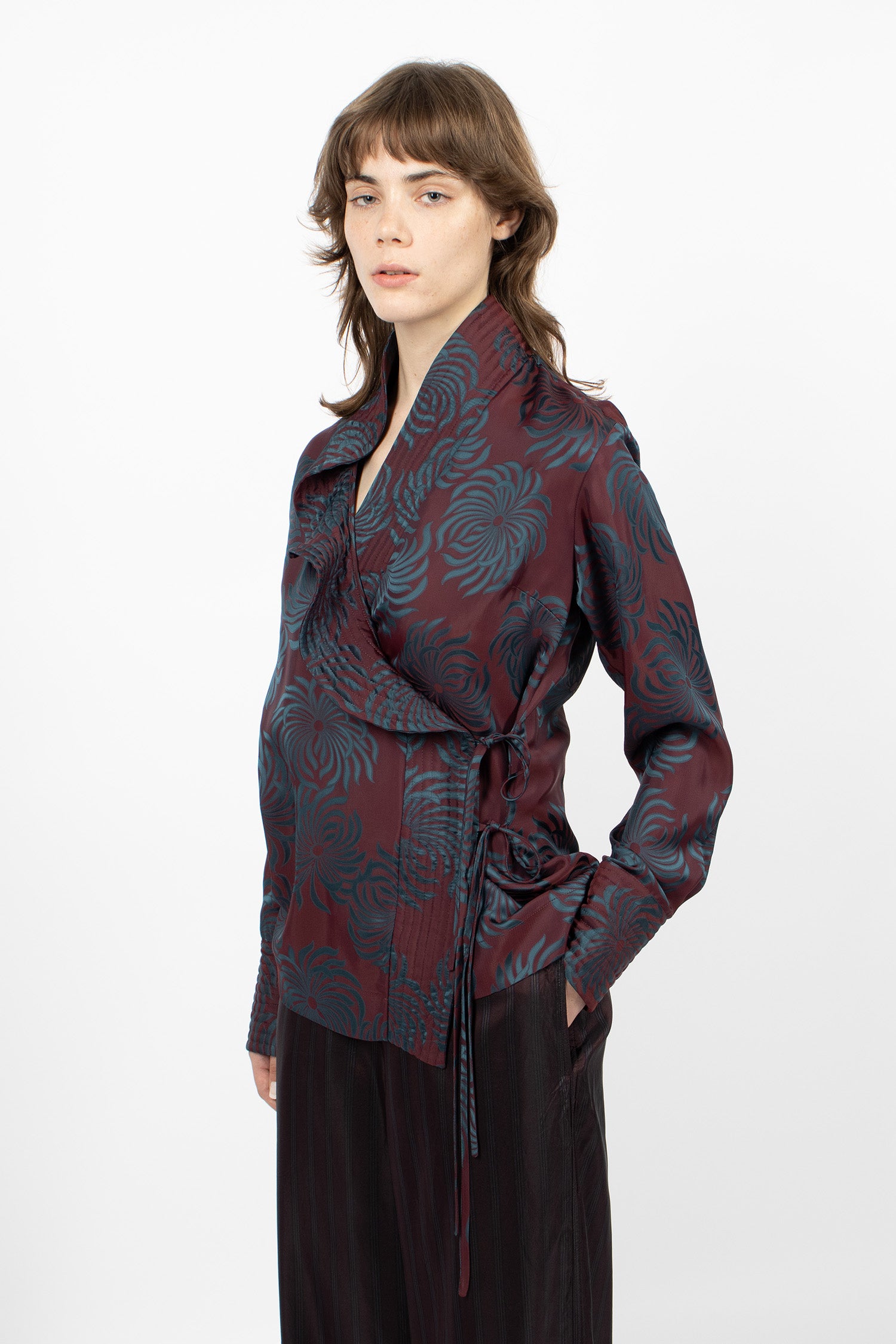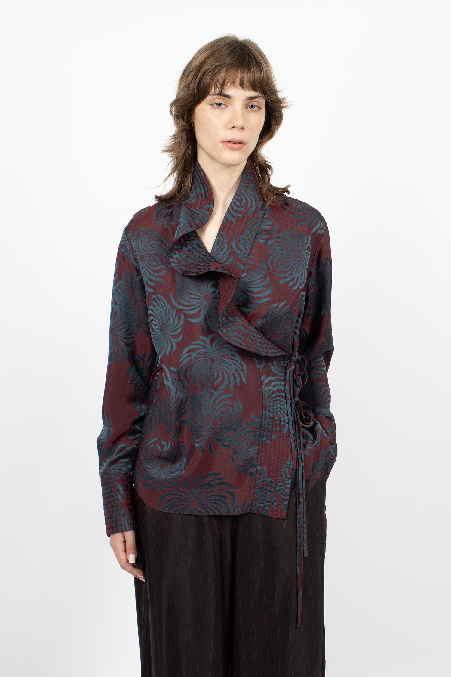 Dries Van Noten printed wrap shirt in burgundy with floral double-dye jacquard. V-neckline with stitched curved edge, dropped shoulder, long sleeves and stitched button cuffs. Self-tie side fastening.