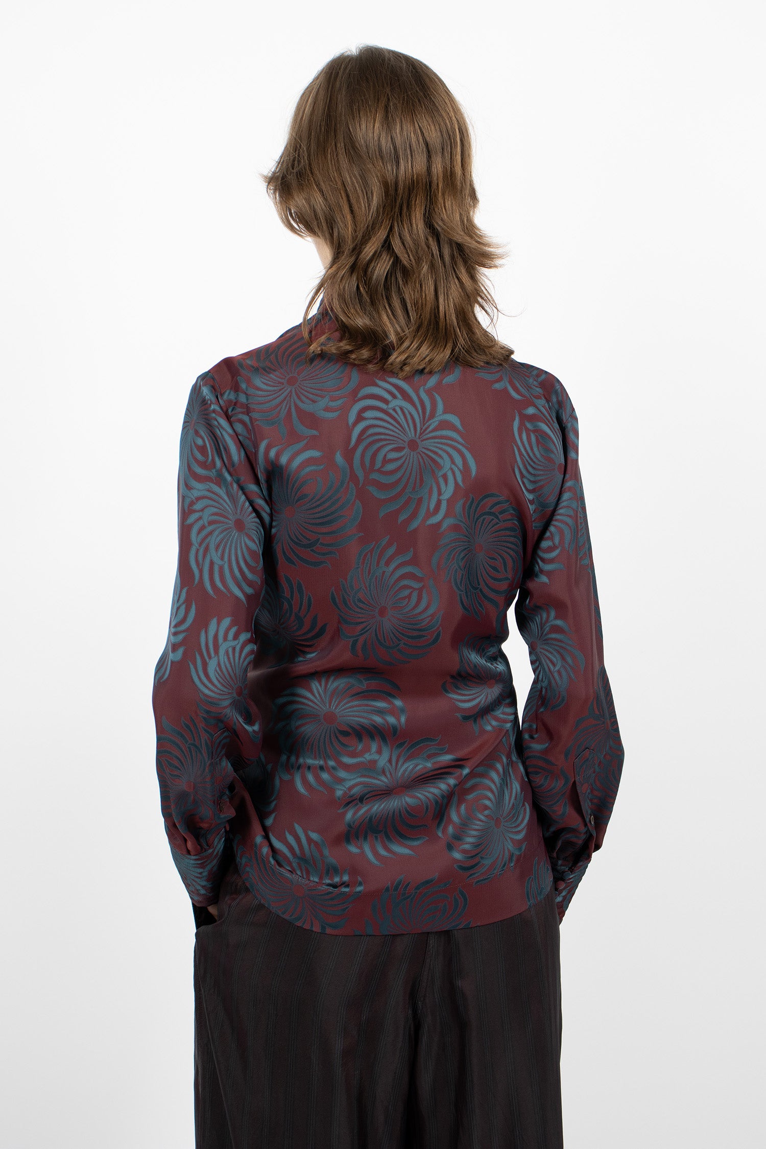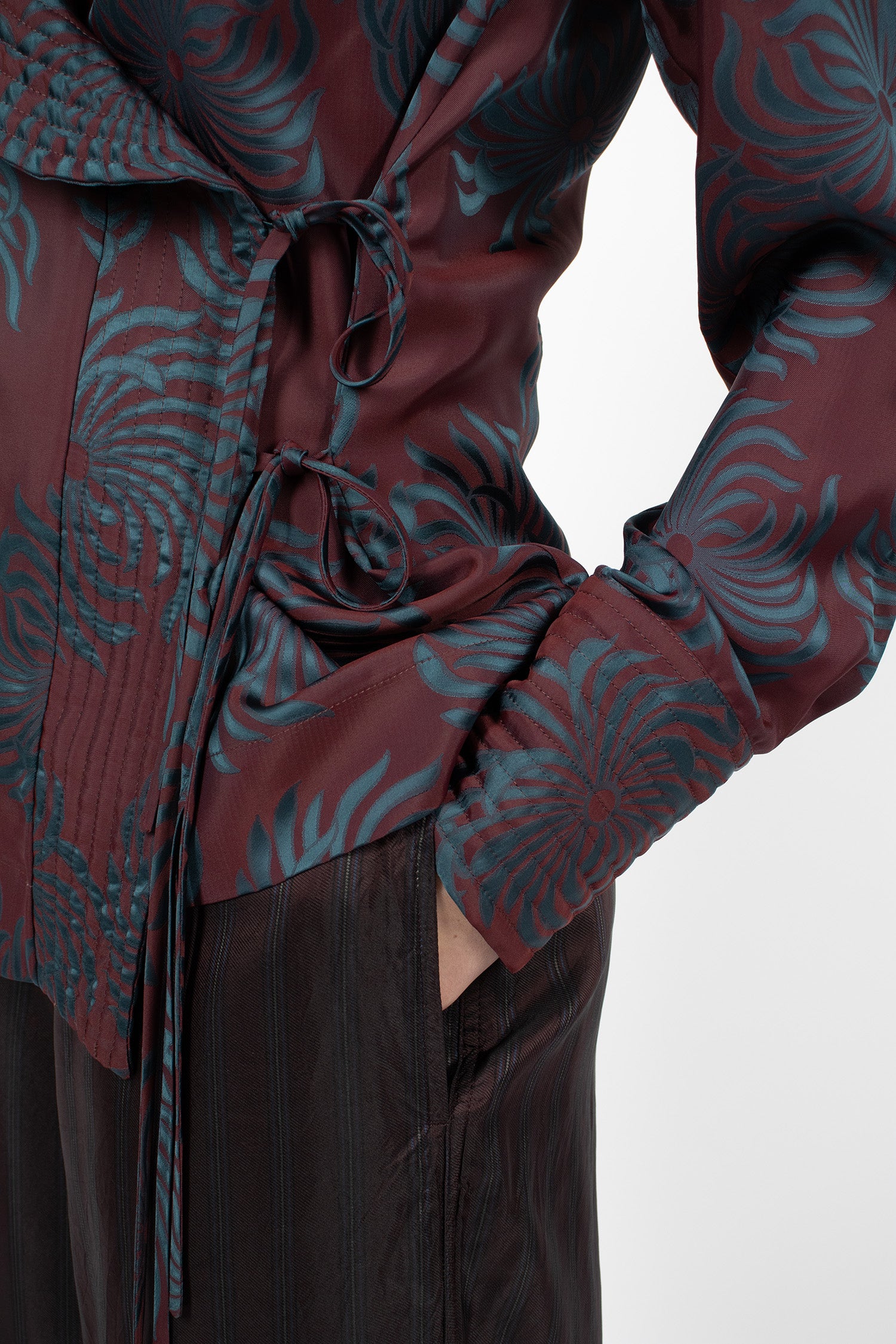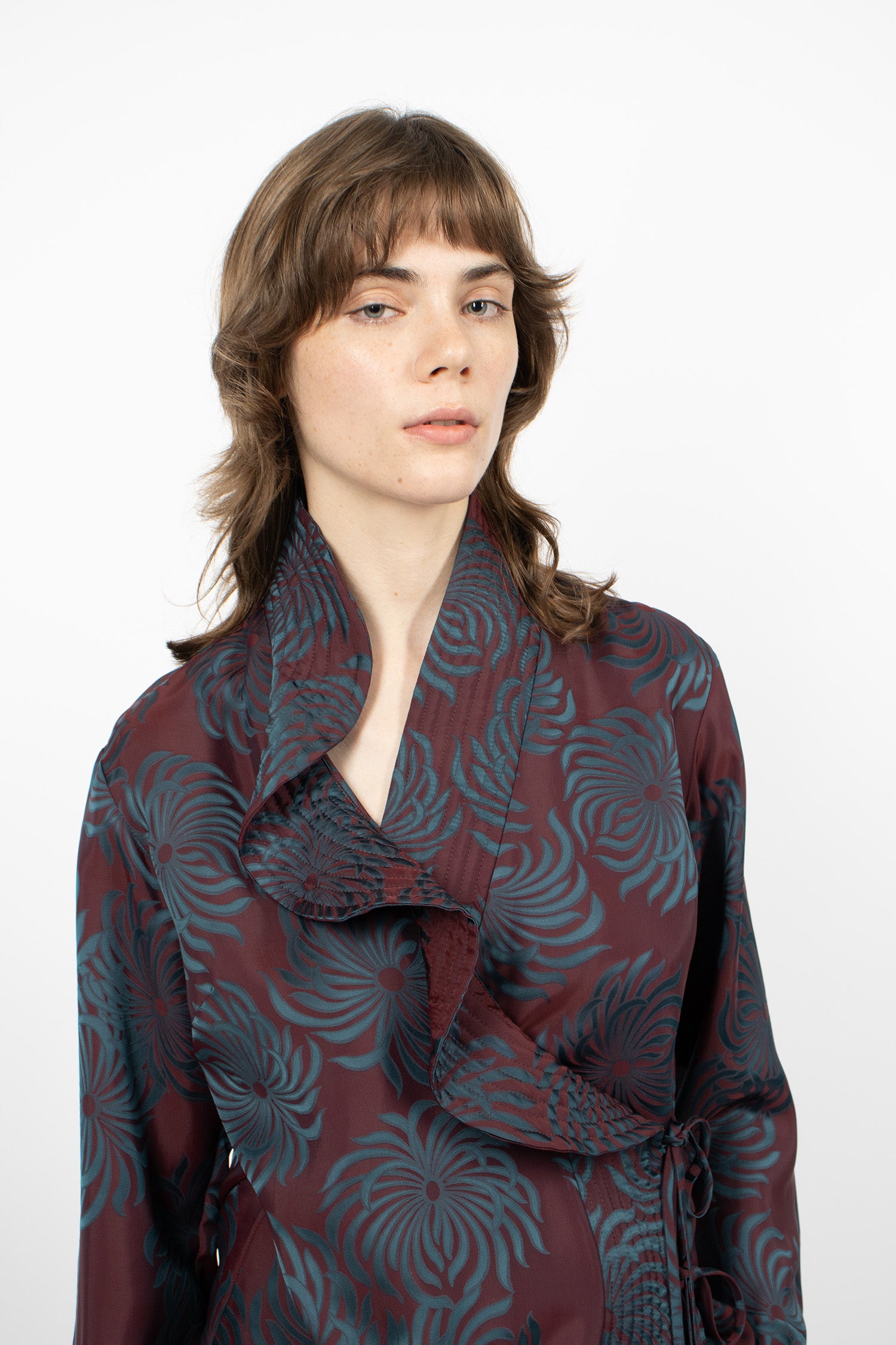 Dries Van Noten printed wrap shirt in burgundy with floral double-dye jacquard. V-neckline with stitched curved edge, dropped shoulder, long sleeves and stitched button cuffs. Self-tie side fastening.